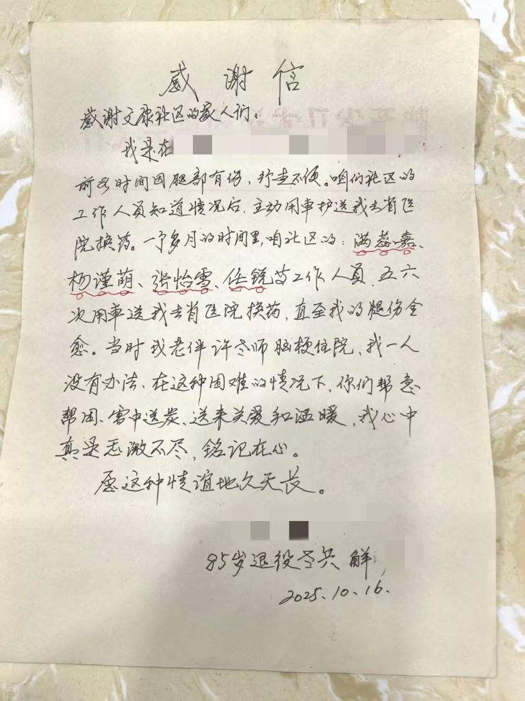 三秦都市报-秦闻讯(记者 姬娜)“在我最无助的时候,是社区陪诊员及时赶到,陪我挂号、看医生、做检查、取药,这份情,我记在心里了!”10月16日,西安市碑林区文康社区办公室内,85岁的解先生双手递上一封感谢信,字迹颤抖却真挚。