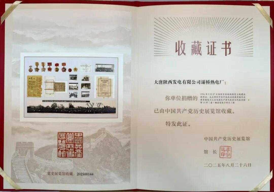 三秦都市报-秦闻讯(徐小东 记者 任荣)近日,大唐灞桥热电厂收到中国共产党历史展览馆寄来的收藏证书,标志着该厂捐赠的13件(套)物品及1张电子照片,正式被该馆收藏。这些珍贵藏品承载着该厂发展历程中的重要记忆,也折射出我国电力事业的发展变迁。国家的收藏与认可,不仅是对该厂历史价值的肯定,更是对电力事业文化传承的鼓励与鞭策。