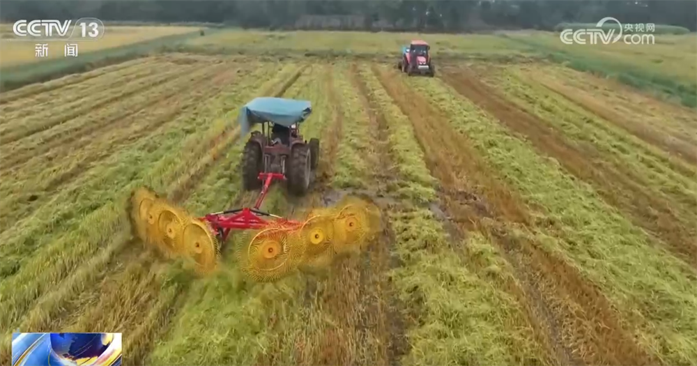 在推进晚稻抢收抢烘的同时,当地还同步开展秸秆综合利用。搂草机和打捆机协同作业,将散落田间的稻草规整收集、压实捆扎,便于运输储存。这些秸秆每亩可为农户增收100多元,实现了生态效益与经济效益双赢。