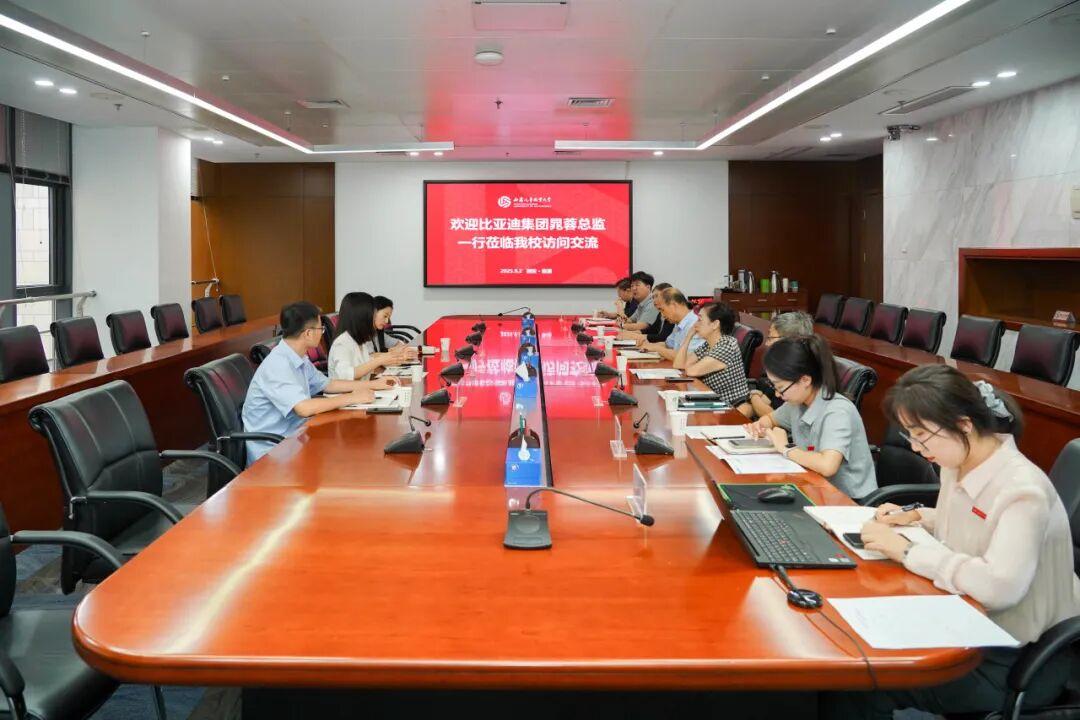 为进一步优化人才供需匹配,深化校企合作,9月2日,西安汽车职业大学与比亚迪汽车产教融合研讨会暨2026届实习就业工作对接会在学校三省楼三楼会议室举行。西安汽车职业大学执行校长雷亚萍、校长助理穆乾坤;比亚迪集团人力资源区域总监晁蓉、集团招聘经理李莉、校企合作经理杨鹏及学校各二级学院负责人参加会议。