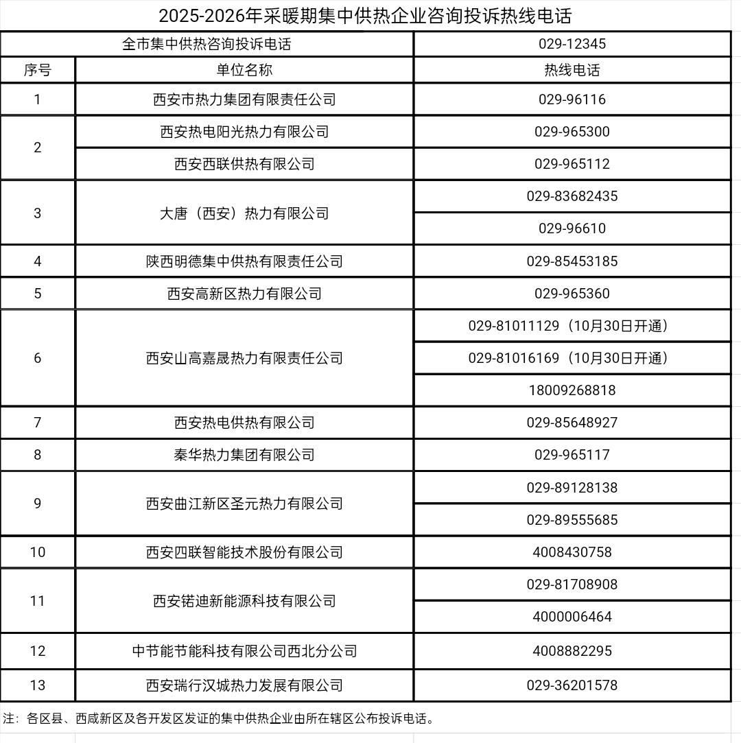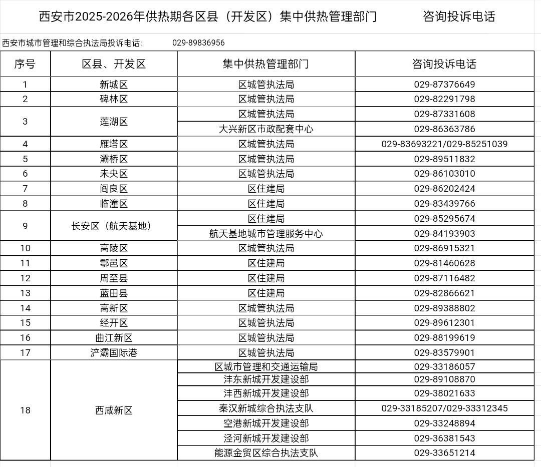 三秦都市报-三秦网讯(记者 赵丽莉)随着西安供热期的临近,为保障市民温暖过冬、及时解决用热问题,西安市城市管理和综合执法局10月22日公布了全市各区县(开发区)集中供热管理部门及各集中供热企业的咨询投诉热线电话,构建起“管理部门+供热企业”的两级服务响应体系,方便市民在遇到暖气不热、缴费疑问等问题时快速咨询、高效维权。