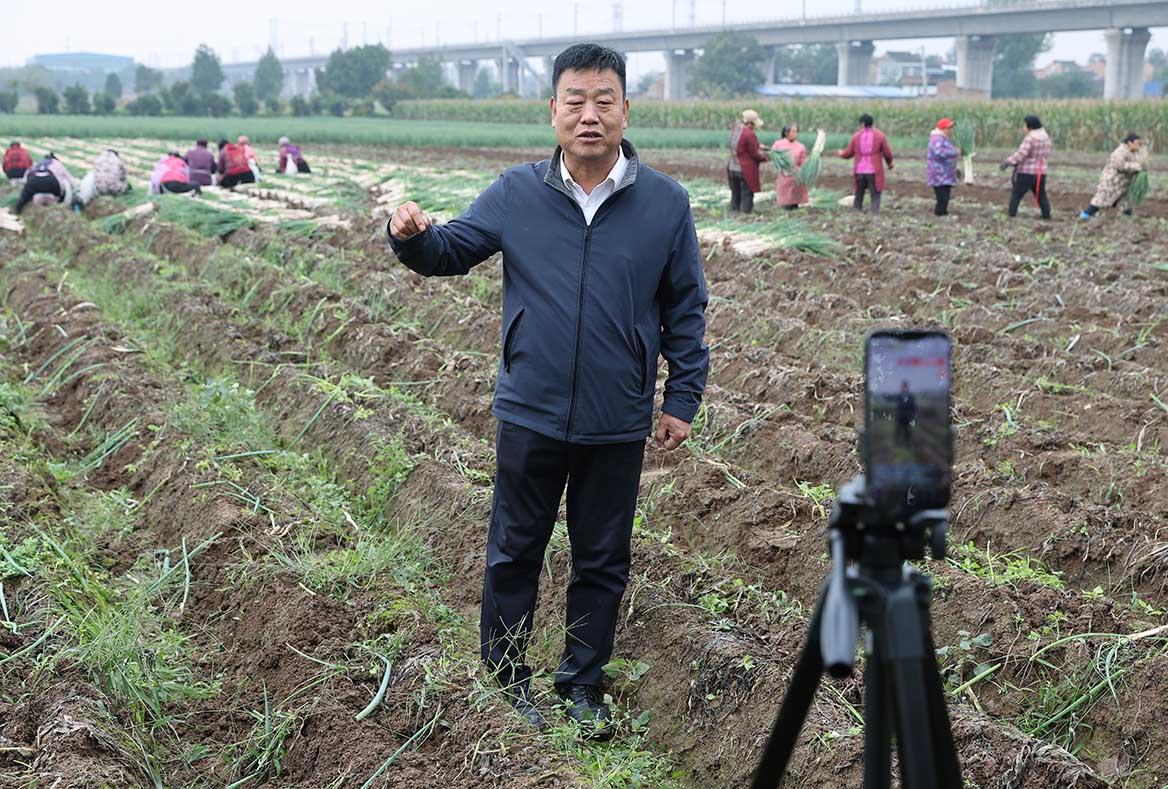 10月22日咸阳兴平市丰仪镇祖坡村的地里,20余位农民正在地里抢收钢葱。“大家可以看到我身后的这些葱,这段时间接连下雨,这葱泡两天就要烂根了,再不收的话今年可能就白干了。我们今天不带货,如果有客商刷到我们的直播愿意收购,可以来现场看看。”正在田间进行直播的是咸阳兴平市丰仪镇水寨村党支部书记李卫国。