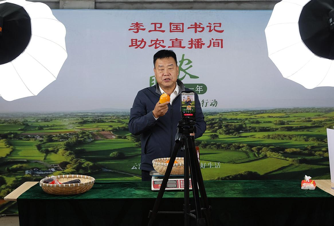 2024年6月,直播团队全面转型,聚焦本地农产品销售。10月22日记者采访当天,直播间里的李卫国正拿着水果热情推介:“这是阳丰脆柿子,跟水果一样好吃,嘎嘣脆,水分足,口感好。这几年咱们脆柿子在兴平种植面积不小,附近还有几十亩的果园,柿子品质都非常好。”他当场咬下一口,向镜头展示:“大家看一下,就这种口感,纯甜,没有一丁点涩味。喜欢吃的话,可以到书记的直播间来看一看,欢迎你们!”