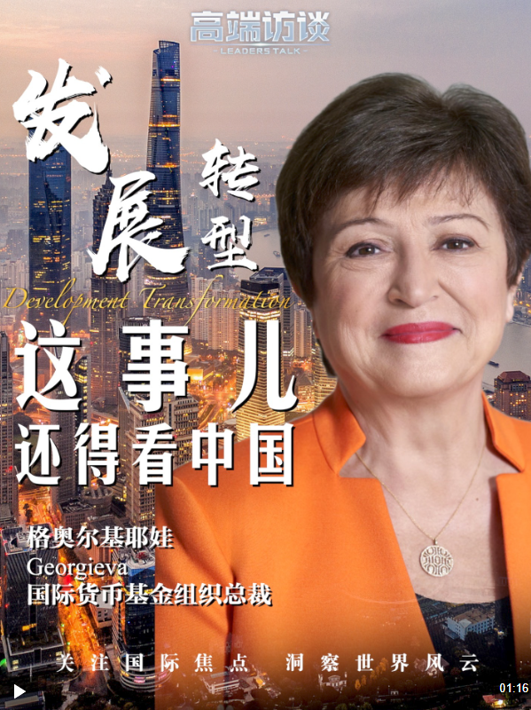 国际货币基金组织总裁格奥尔基耶娃接受总台《高端访谈》栏目采访时说,见证中国发展是件非常有意义的事情。她表示,中国的成功不仅仅在于提高了人民的生活水平,还在于让全体人民共享发展成果。