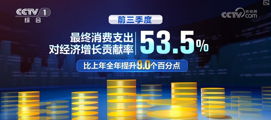 前三季度,最终消费支出对经济增长贡献率达到53.5%,比上年全年提升9.0个百分点,继续发挥经济增长主引擎作用。