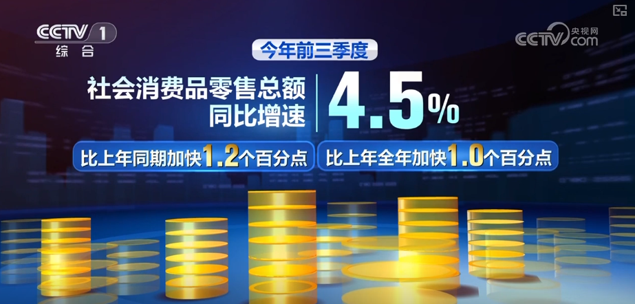 4.5%,这是2025前三季度社会消费品零售总额同比增速,这一速度,比上年同期、上年全年分别加快1.2个和1.0个百分点,反映出市场销售平稳增长。