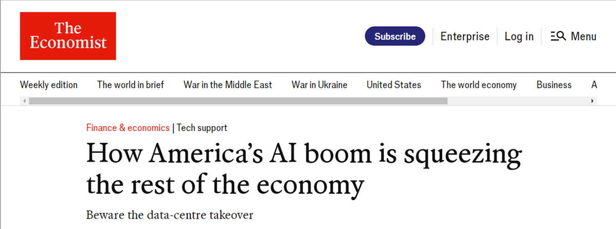 英国《经济学人》杂志近期评论指出,除了人工智能之外,美国经济的大部分领域似乎都显得低迷。AI爆发式增长虽能“美化”数字,却忽略了美国实体经济的空心化,导致GDP含金量低。