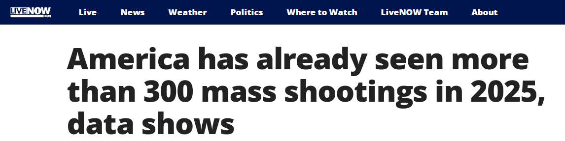 据美国福克斯LIVE Now即时新闻报道,非营利机构“枪支暴力档案”的数据显示,自2025年1月1日至10月14日,美国共发生了340起除枪手外造成至少四人中枪的枪击事件。