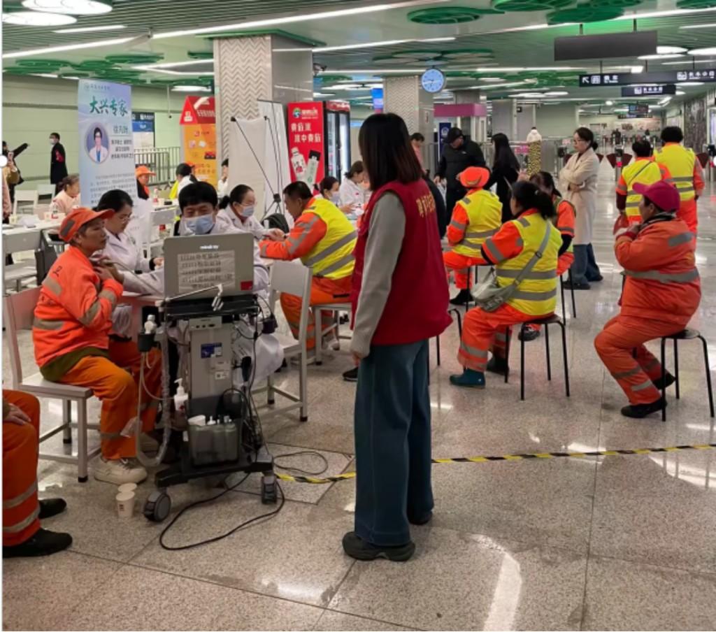 活动现场,医护人员耐心细致地为每一位参与活动的环卫工人提供健康服务。他们认真询问工人的身体状况,有序开展血压测量、基础查体等健康检查,并根据个体情况给予个性化的健康指导和建议。环卫工人们自觉排队,与医护人员亲切交流,现场秩序井然、氛围温馨。