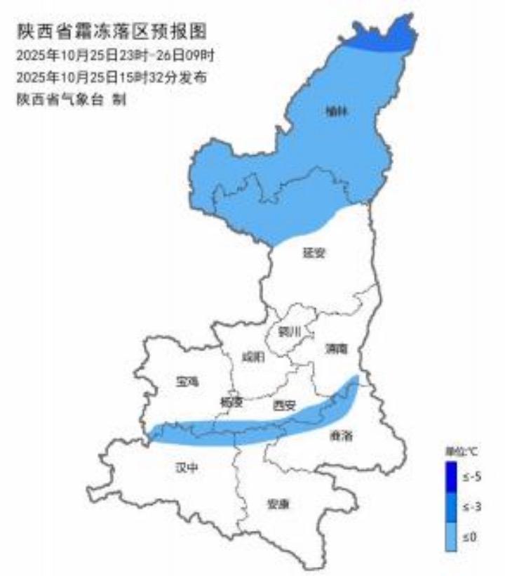 三秦都市报-秦闻讯(记者 陶颖)陕西省气象台2025年10月25日17时00分发布霜冻蓝色预警:受冷平流和辐射降温共同影响,10月25日23时至26日9时延安北部(宝塔区、安塞区、甘泉县、吴起县、志丹县、子长市、延川县)、榆林市全域、秦岭山区部分地方最低气温将降至-4℃~0℃; 10月26日20时至27日9时延安市全域 、榆林市全域、秦岭山区部分地方最低气温将降至-4℃~0℃, 可能出现对当季主要农作物产生影响的霜冻天气。