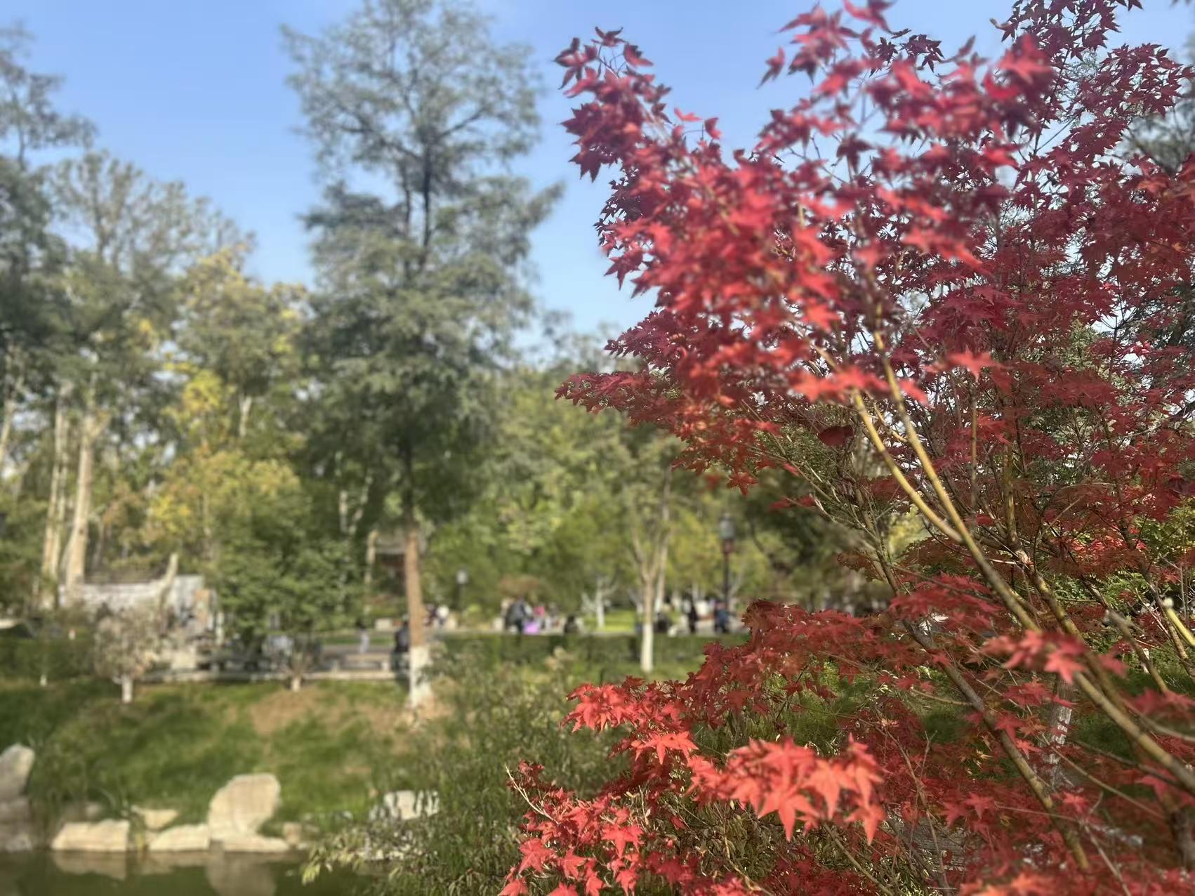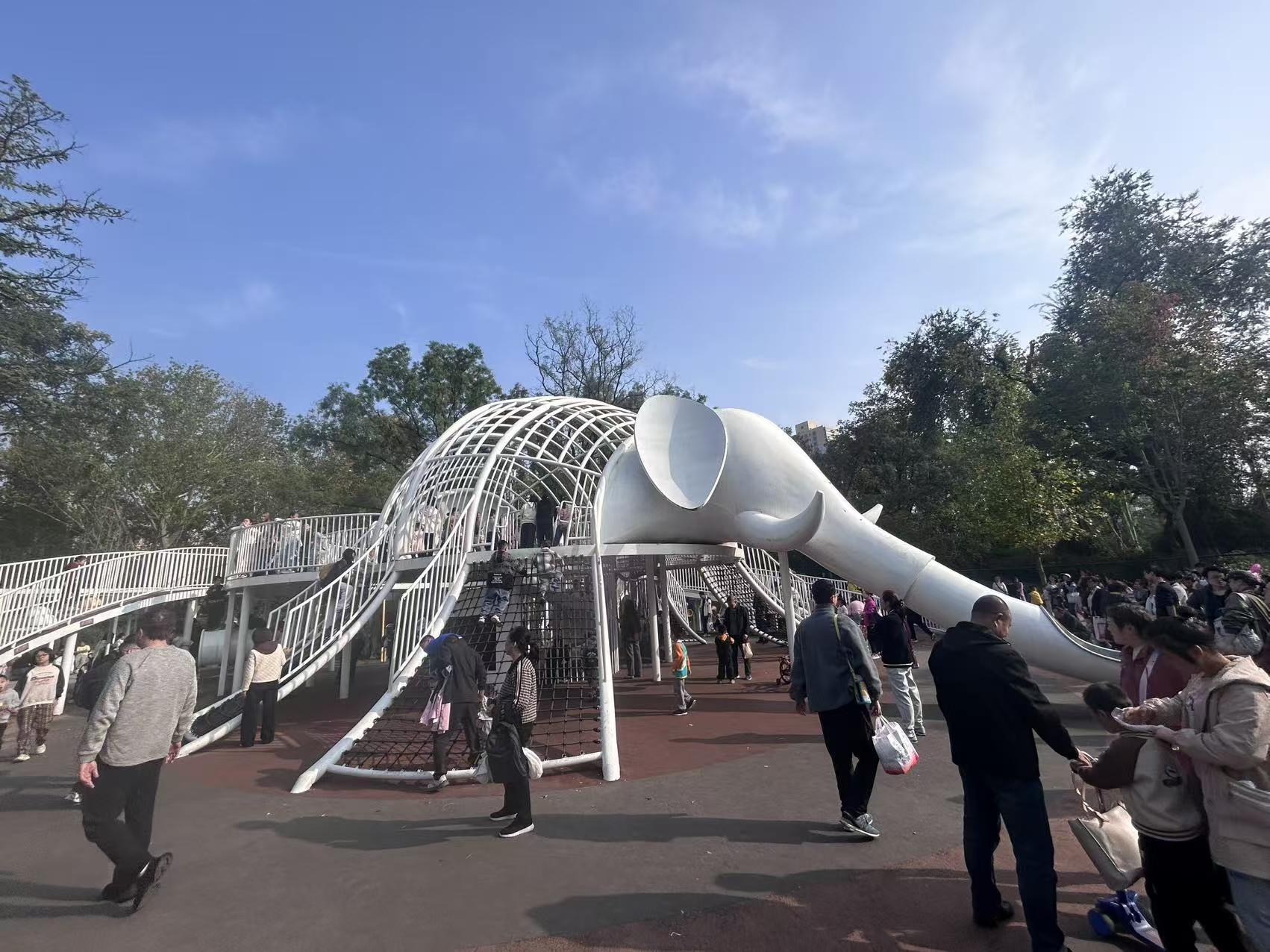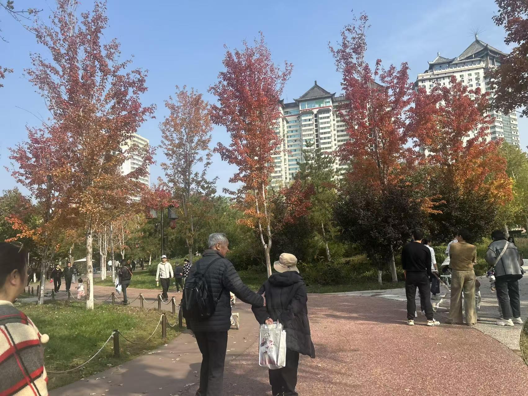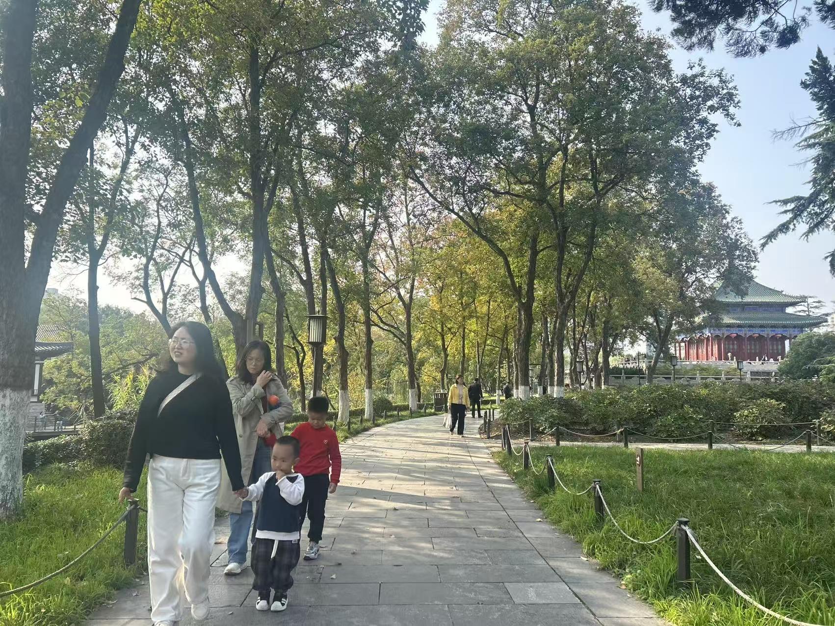 秋日的阳光不燥不烈,透过层层叠叠的枝叶,在地面洒下斑驳的光影。公园入口处,推着婴儿车的家长、牵着孩子小手的老人、三五结伴的年轻人络绎不绝,公园内的游乐设施前排起了小长队,工作人员忙着引导人流,脸上也挂着被阳光晒暖的笑意。“天天下雨,今天终于晴了!”市民李女士操着一口软糯的南方口音,一边给家乡的朋友打电话,一边牵着5岁的儿子往公园里走,“难得的好天气,绝不在家待着,带娃来晒晒太阳,补补‘阳光维生素’。”