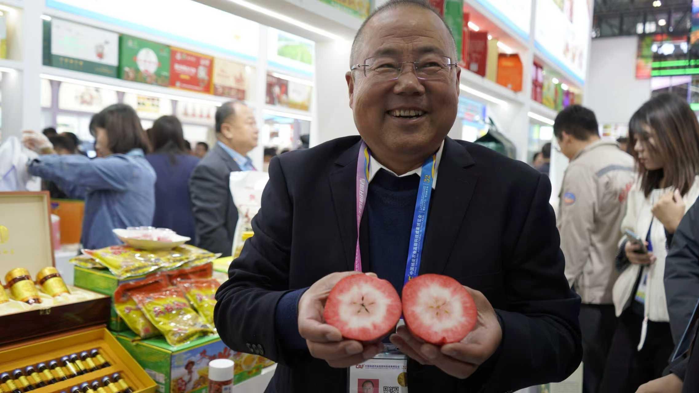 展区内,“红色之爱”果汁备受青睐,县农安中心主任刘志德忙得不可开交,一边招呼观众品尝现榨果汁,一边介绍产品故事。杯中粉红色的果汁酸甜适口,满口都是苹果的清香,引得不少人驻足回味。“这可是咱小河镇巨浪村的‘致富果’!”刘志德笑着说,2021年该村村民王振忠引进“红色之爱”苹果品种,经过精心培育,今年已是第二次挂果,“去年75亩果园卖了60多万元,今年收成更好,收入直接超过150万元,翻了一倍还多,乡亲们的日子越过越有盼头!”