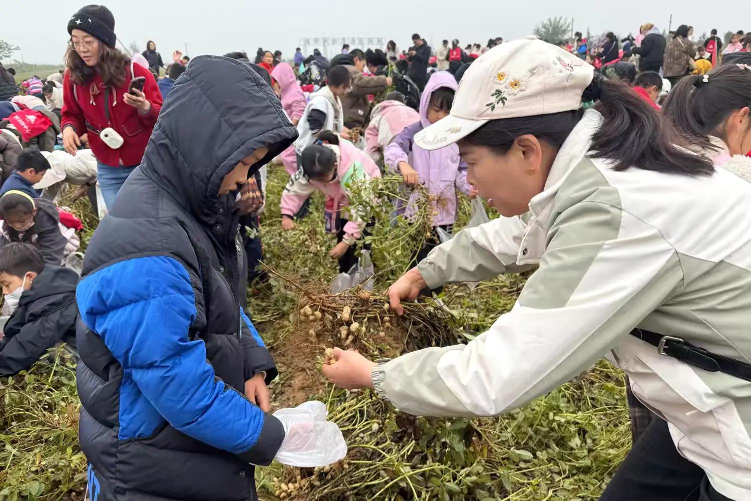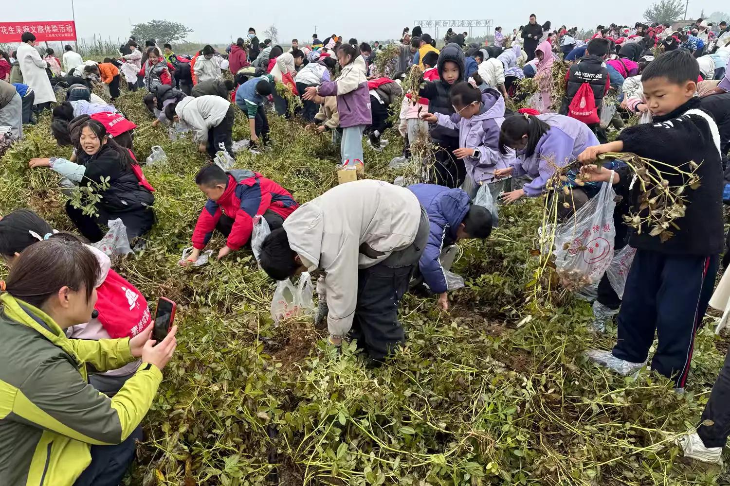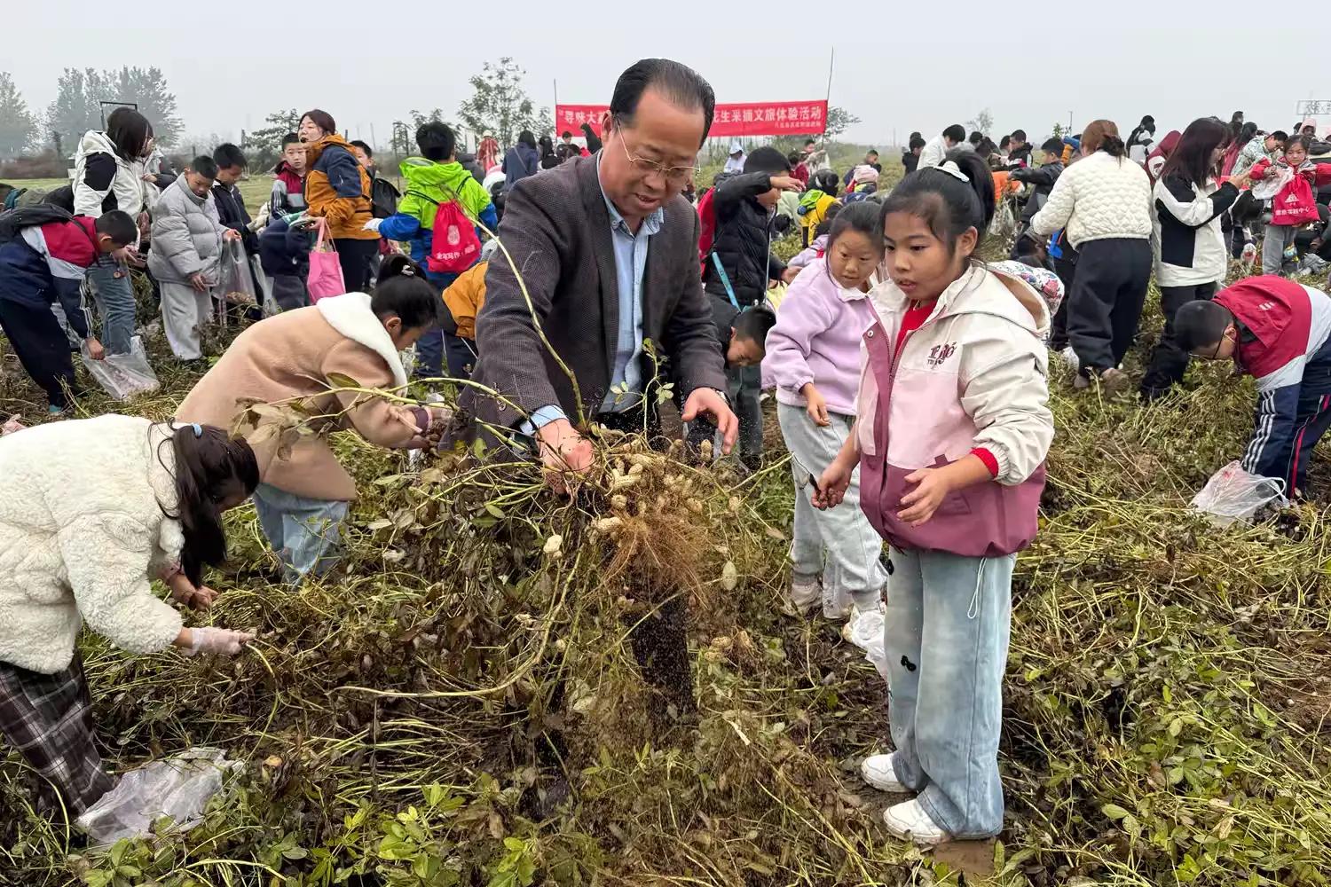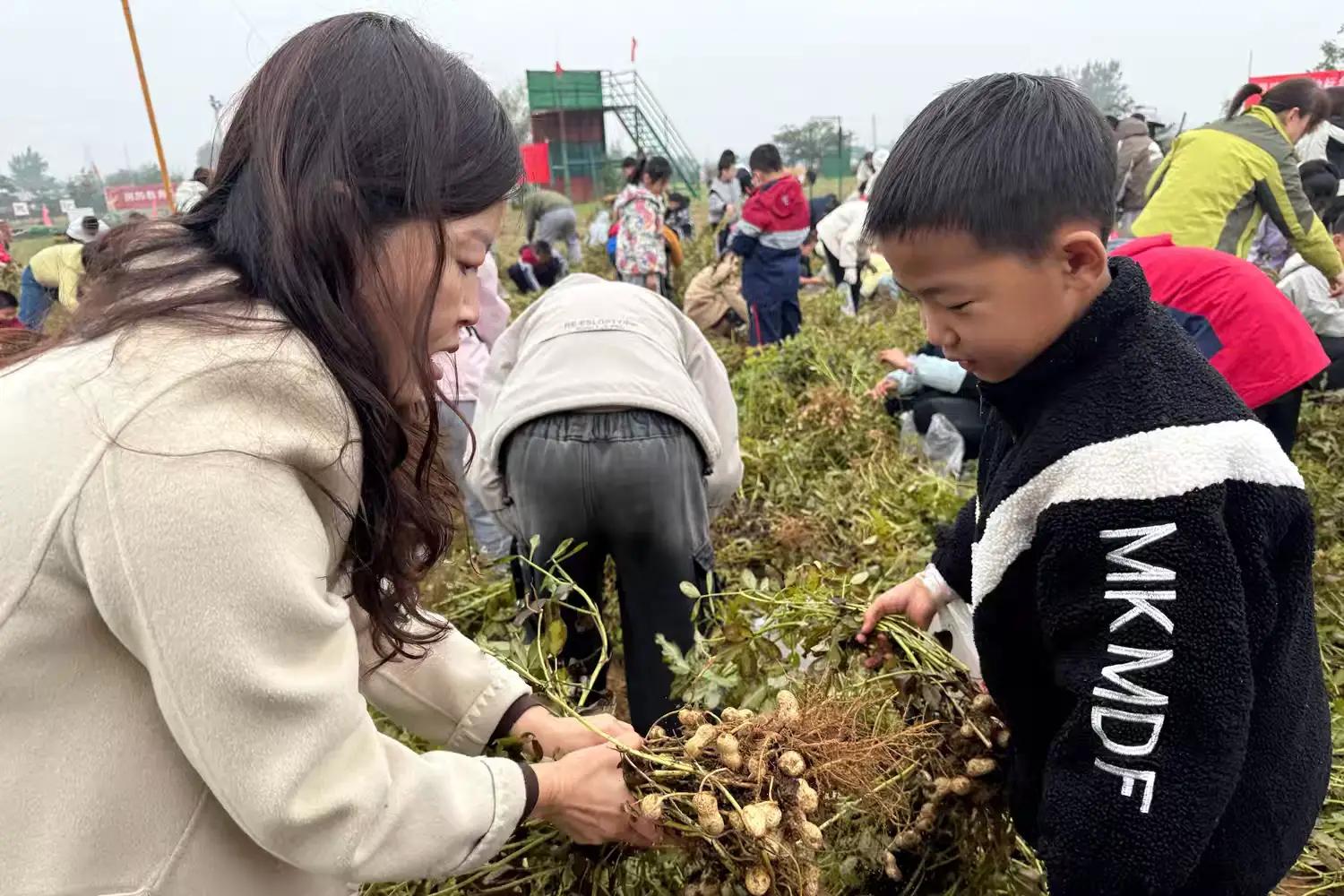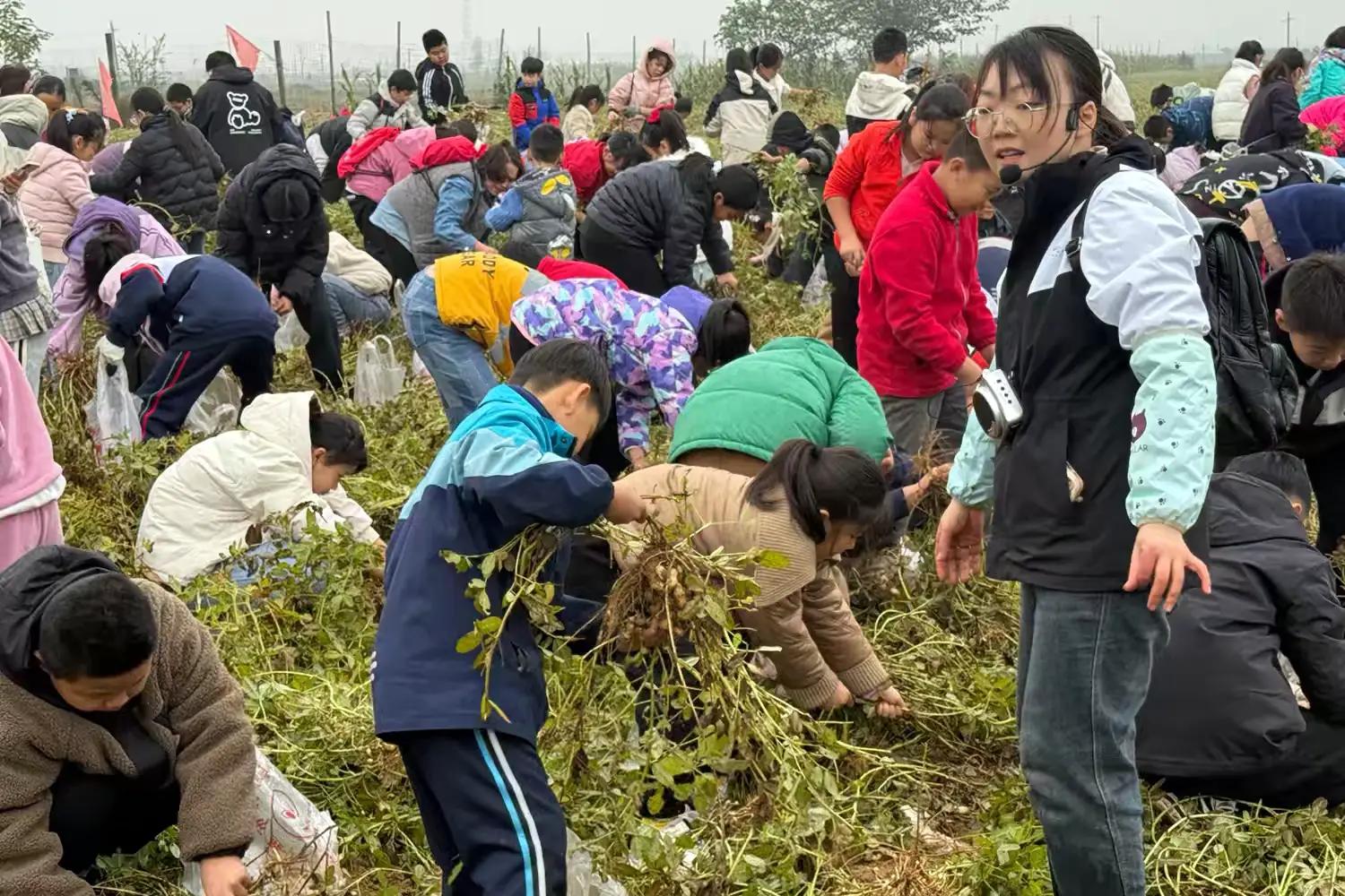 “快看,这株花生结了好多‘胖娃娃’!”在花生种植研学基地,四年级学生严笑微用力拔出一丛花生,饱满的果实在阳光下泛着油光,她兴奋地数着颗数,原以为花生长在地面,今天一来才知道花生长在地下。