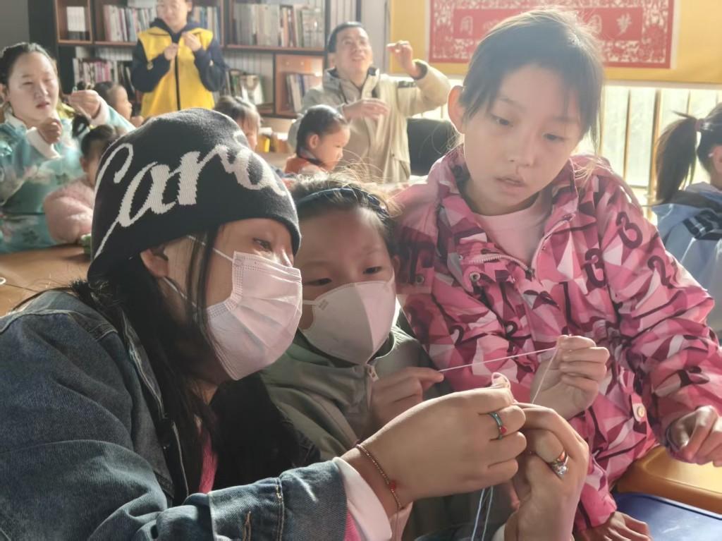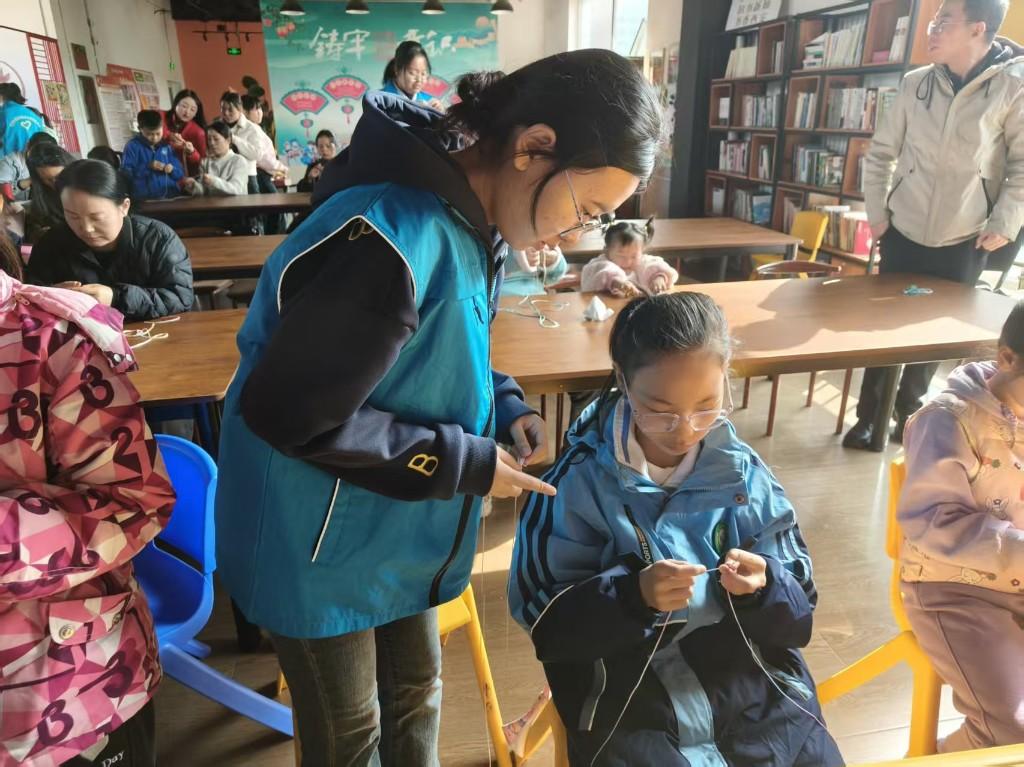 然而实操中挑战频现:孩子因手部力量不足,绳结松散;家长急于求成,频频出错。张会巡回指导技法,张婕则蹲在孩子身边手把手示范,并轻声提醒家长:“别急,跟着孩子的节奏来,慢一点,也是陪伴的一部分。”