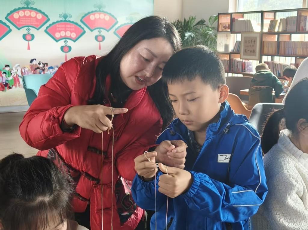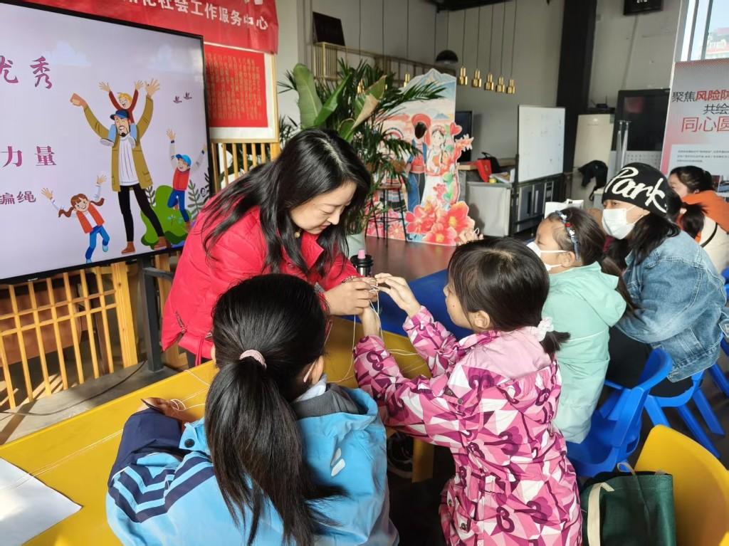 编绳环节,张会采用“理论讲解+现场演示+一对一指导”模式,从“平结”“吉祥结”入手,细致拆解绕线、打结、固定等步骤。彩绳在她指尖翻飞,瞬间化作规整绳结,引来家长与孩子阵阵惊叹。