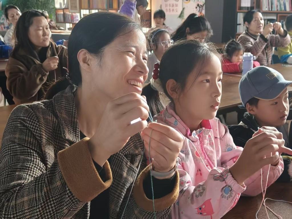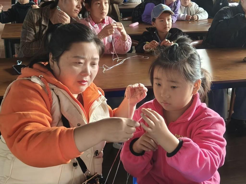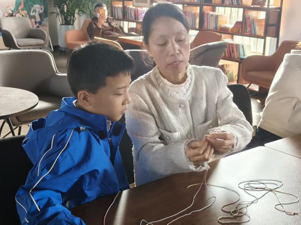 在老师的引导下,亲子组合逐渐找到默契。有的孩子主动提议:“妈妈,我来绕线,你打结!”展现出清晰的逻辑思维;有的家长在孩子沮丧时轻声鼓励:“我们一起拆了重来,妈妈陪你慢慢试!”用耐心化解畏难情绪。这不仅是一次手工学习,更是一场成长教育的实践——孩子在反复尝试中提升动手能力与抗挫折力,家长则在陪伴中学会用支持代替指责,用耐心代替催促。