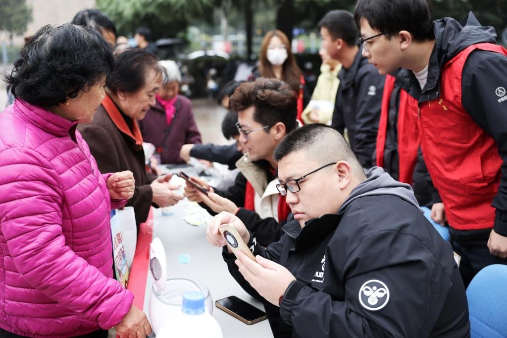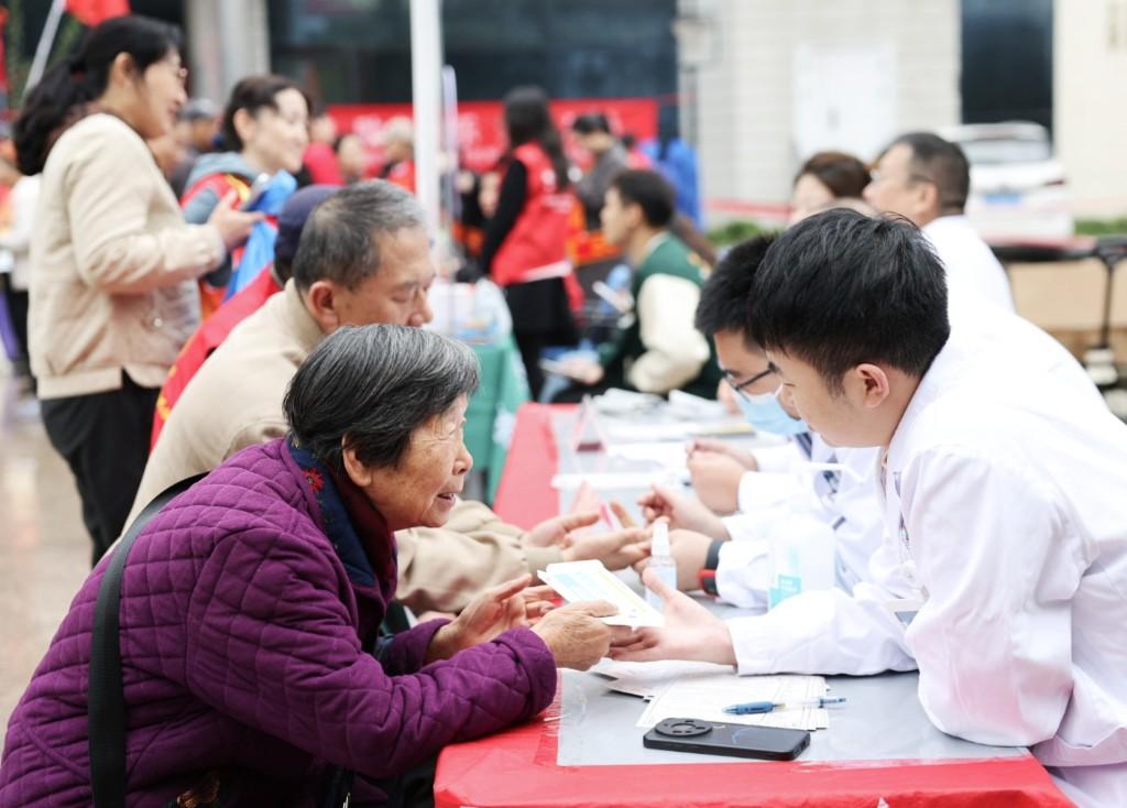 义诊区是现场最热闹的点位之一。医护人员刚摆好设备,不少老年人便在服务点位前排起了队。“医生,我最近总头晕,您帮我看看血压高不高?”一位老先生如是说。听闻此言,医护人员拿出血压仪测量后嘱咐道:“降压药要按时吃,少盐少糖,按时到社区医院测血压。”