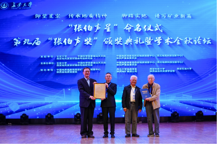 10月25日,“张伯声星”命名仪式暨第九届“张伯声奖”颁奖典礼在我校长安文化艺术中心大礼堂举行。本次活动由长安大学、中国科学院紫金山天文台、中国地质调查局西安调查中心、西安地壳波浪状镶嵌构造研究会、张伯声基金委员会等单位主承办,旨在永恒铭记张伯声先生为我国地质科学与教育事业建立的丰功伟绩,传承与弘扬科学精神,激励新一代地质工作者勇担使命、开拓创新。