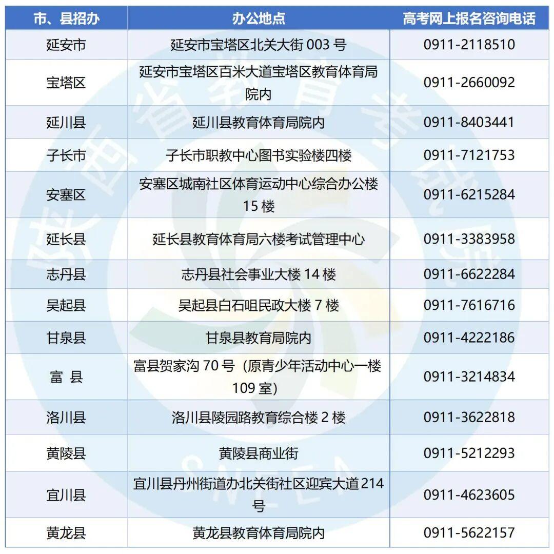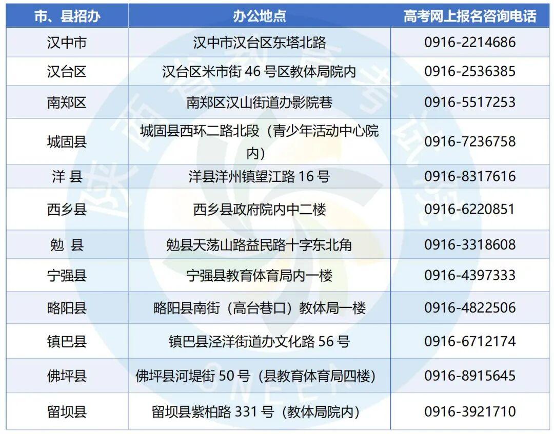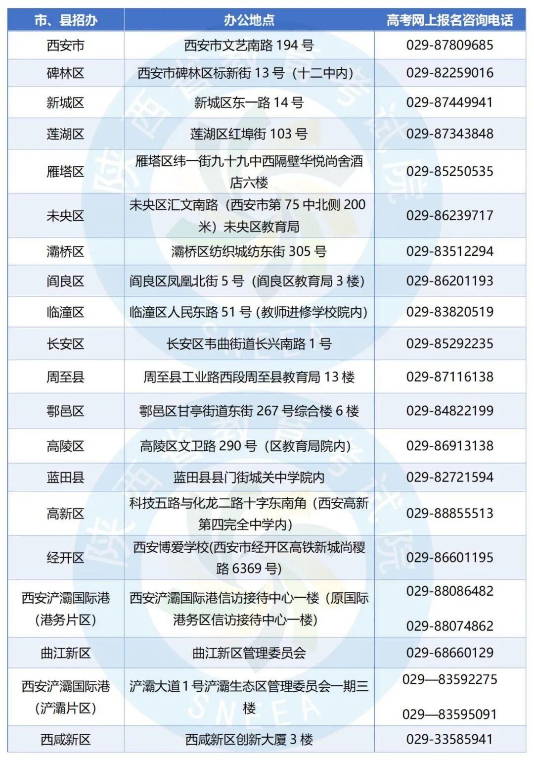 2026年陕西省高考网上报名将于2025年11月1日正式开始,报名过程中,考生如遇到政策类问题,请拨打以下各县(区)招办电话咨询。