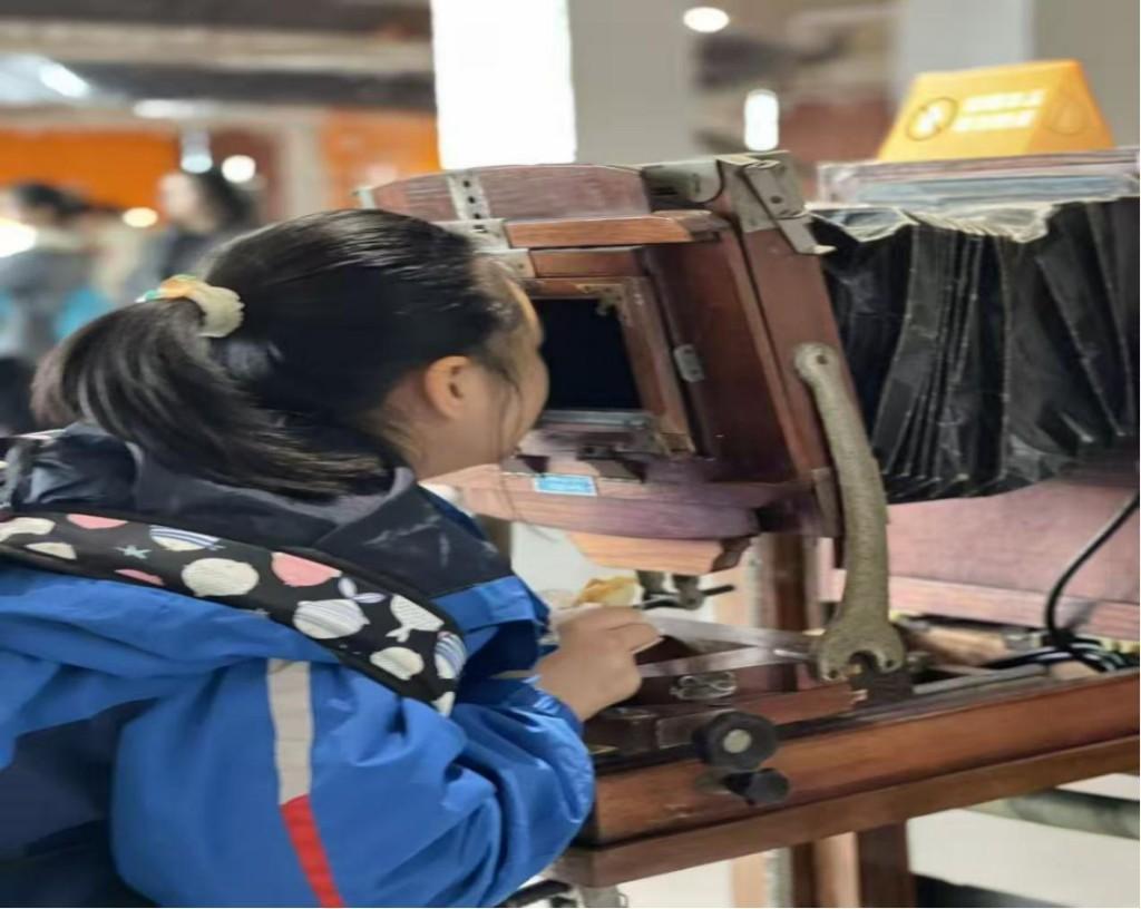 活动当天,孩子们在志愿者一对一的精心陪伴下,沉浸式探访西影博物馆的各个展区。步入“星光大道”,志愿者俯身轻语,为孩子们讲解地面镌刻的奖杯图案,孩子们好奇地伸手触摸,眼中闪烁着求知的光芒;在老爷车展厅,复古的电影道具车成为焦点,志愿者通过生动的故事讲述,将静态展品转化为可感可知的影像记忆;军事主题展区逼真的场景复原让孩子们仿佛置身片场,志愿者手把手引导他们认识道具装备,在互动中激发探索兴趣;电影胶片收藏馆内,老式放映机与泛黄胶片承载着岁月印记,孩子们亲手操作简易放映装置,目睹胶片转动间光影的诞生,切身感受电影技术的发展历程。