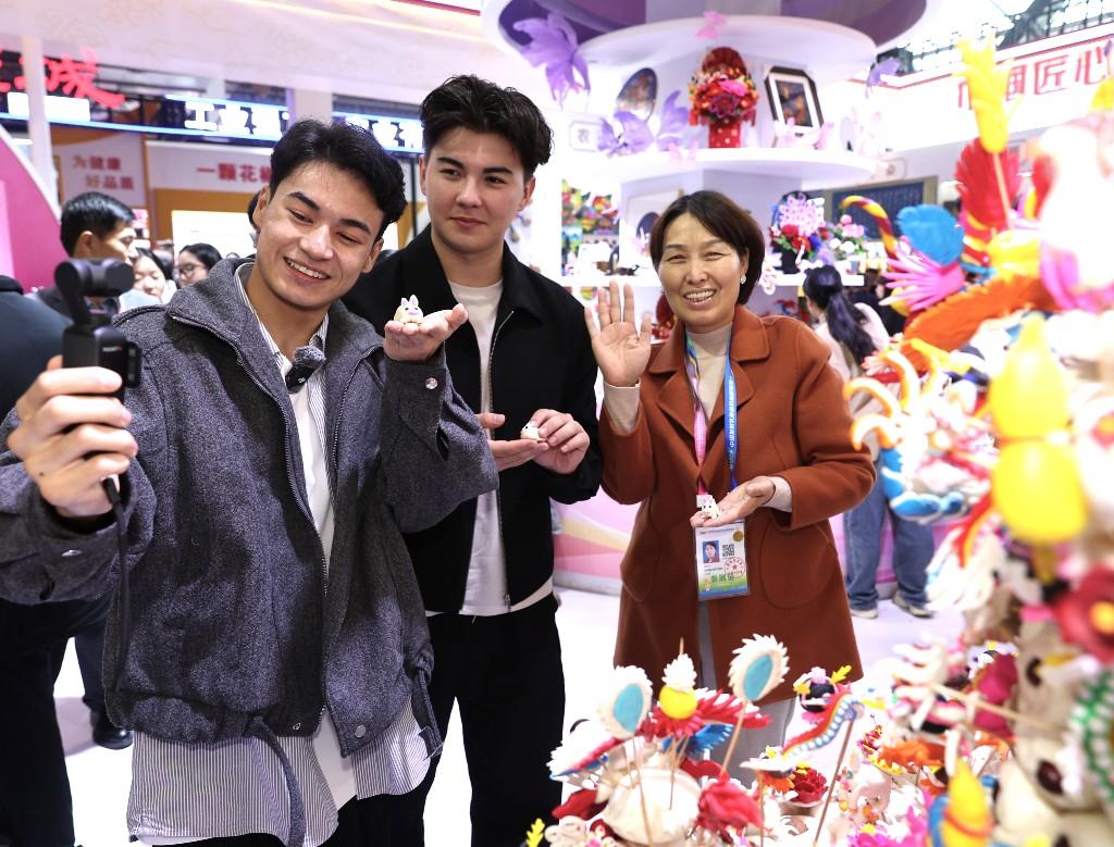 逛展间隙,两人分享起各自的感受。展位角落,几顶色彩鲜艳的羌族虎头帽引起了两人的注意。明小林拿起一顶戴在头上,虎头帽上的刺绣栩栩如生。“这个帽子好可爱,是给小朋友戴的吗?”江哲掏出手机,帮他拍下这有趣的一幕。工作人员介绍,虎头帽是羌族的传统服饰配饰,不仅能保暖,还寄托着“驱邪避灾”的美好愿望,“现在我们把它做成了文创产品,很多游客都会买回去当礼物。”