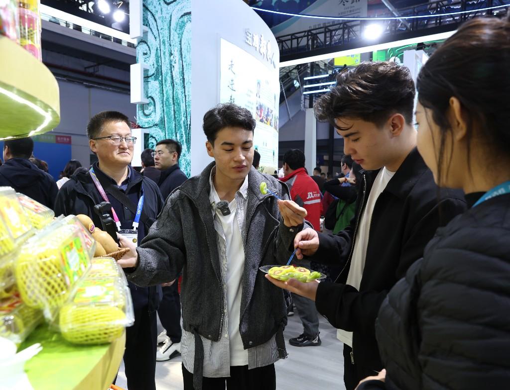江哲则被旁边的猕猴桃吸引,展台上的猕猴桃有绿心、黄心、红心三种,切片后像彩色的宝石。“我们国家的超市里也有猕猴桃,但只有绿心一种。”他拿起一块黄心猕猴桃尝了尝,“像蜂蜜一样。”工作人员笑着介绍:“这是我们培育的新品种,糖度能达到18度以上,而且耐储存,运到你们国家也能保持新鲜。”