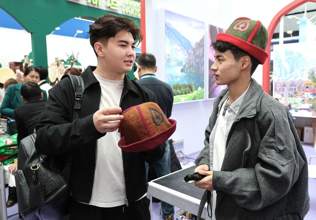 这次逛农高会,江哲最大的惊喜是在国际展区看到了吉尔吉斯斯坦的展位:“展位上挂着我们国家的国旗,还有民族服饰和手工地毯,我一下子就觉得特别亲切。遇到了展位上的同胞,我们用家乡话聊了一会。”