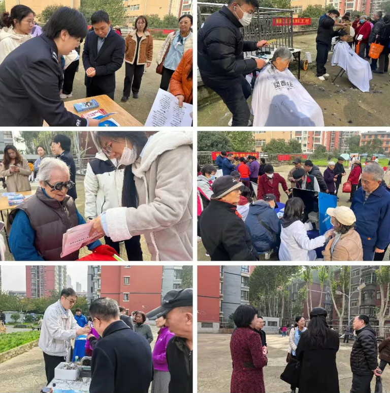 本次活动的“重头戏”——便民公益集市,以其务实、精准的服务赢得了居民们的一致好评。集市聚焦老年人日常生活的实际需求,整合了多方资源,设立了九个公益服务摊位。健康咨询区前,甲状腺彩超筛查、血糖检测和口腔义诊的医护人员耐心细致,为居民提供专业的健康检查与咨询,让老人们足不出户就能了解自身健康状况。生活服务区更是人气爆棚:免费理发摊位前,理发师傅手艺娴熟,让长者们焕发新颜,精神抖擞;磨刀师傅的摊位也围满了人,“嚓嚓”的磨刀声成为了现场最朴实动听的音符;免费手机贴膜、为60岁以上老人免费配老花镜等服务,切实解决了老年人在数字时代和日常生活中的“小麻烦”。此外,免费小盆栽制作带来了动手的乐趣,而居民医保政策宣传、反诈宣传和法律援助等摊位,则通过工作人员耐心的讲解,为老人们的幸福晚年生活增添了一份知识与安全的保障。