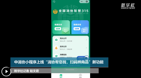 中国消费者协会“全国消协智慧315”小程序近日上线“消协帮您找,扫码辨商品”新功能,为消费者网购商品提供便捷的信息核验渠道。