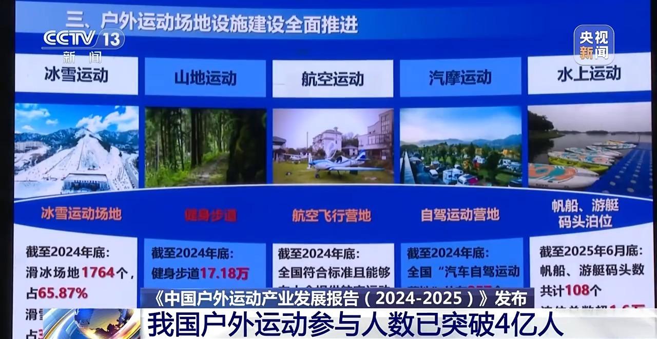 根据报告,截至2025年4月初,我国户外运动参与人数已突破4亿人。中青年群体是户外运动主要消费者,其中25—34岁群体占比最高。从消费项目看,冰雪、山地、水上项目参与度较高。