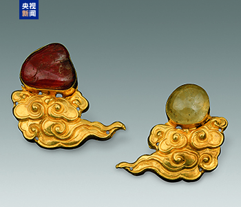 △梁庄王墓出土的云形金镶宝石饰,湖北省博物馆藏