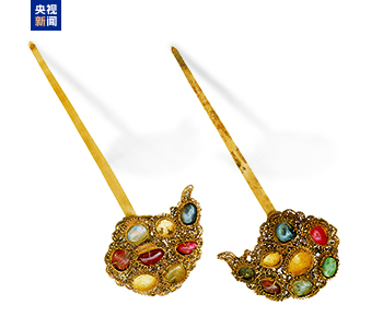 △梁庄王墓出土的云形金累丝镶宝石簪,湖北省博物馆藏