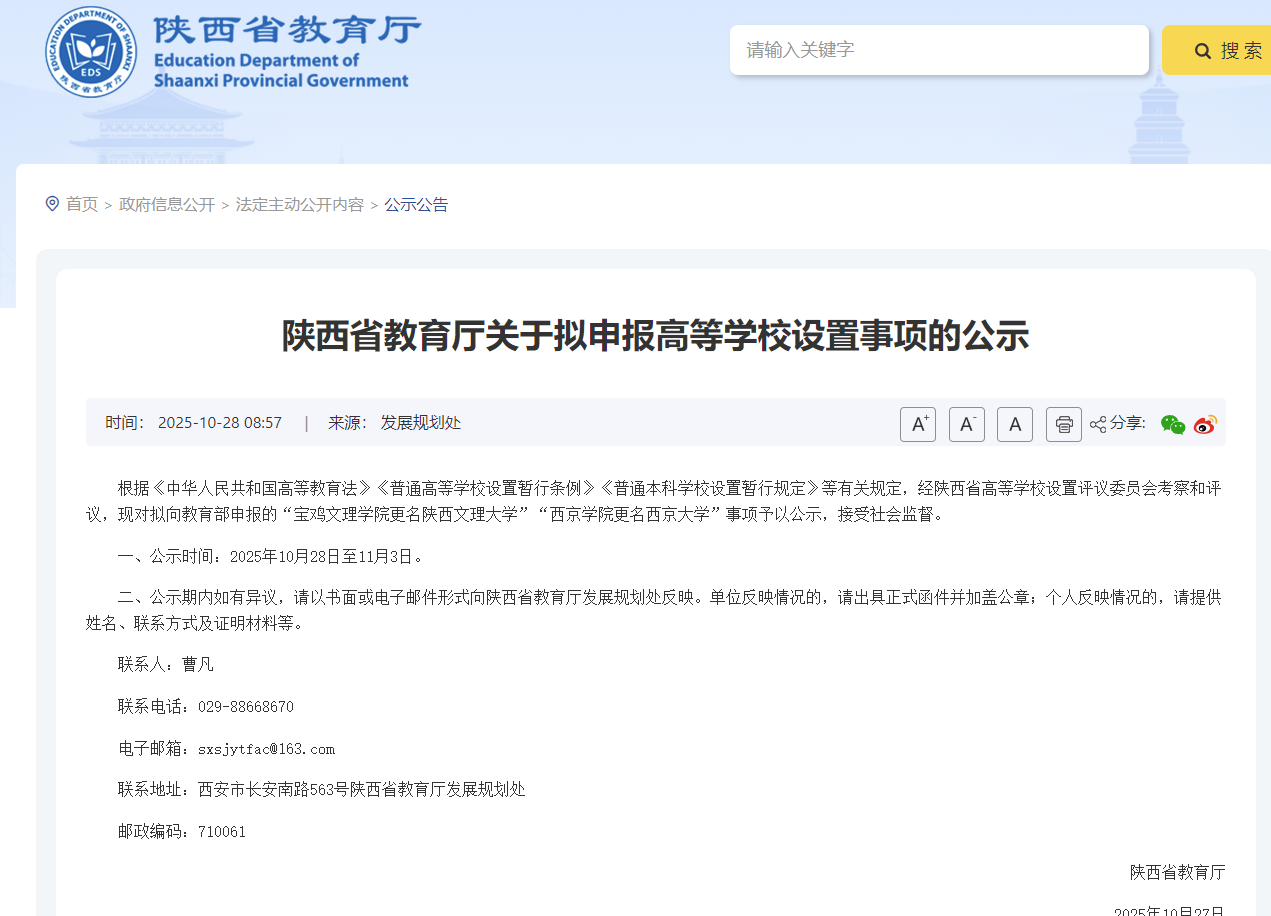 三秦都市报-三秦网讯(记者 张彦刚)10月28日,记者获悉:陕西省教育厅发布关于拟申报高等学校设置事项的公示明确:根据《中华人民共和国高等教育法》《普通高等学校设置暂行条例》《普通本科学校设置暂行规定》等有关规定,经陕西省高等学校设置评议委员会考察和评议,省教育厅对拟向教育部申报的“宝鸡文理学院更名陕西文理大学”“西京学院更名西京大学”事项进行公示,接受社会监督。