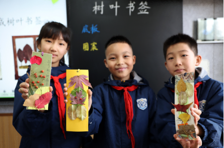 大家围坐在铺满各色自然素材的桌前,一双双灵巧的手将脑海中构建的图案呈现在底板上。有的将红枫叶与银杏叶重叠,配上绿色的松针,做出扇子的图案;有的把小巧的花瓣点缀在梧桐叶边缘,仿佛叶片上开出了童话般的小花;有的还在图案旁留下娟秀的字迹。不一会儿,一件件独具创意的书签纷纷亮相,孩子们将这些“自然的馈赠”夹进书中,翻开时仿佛字里行间也透着一抹温柔秋意。