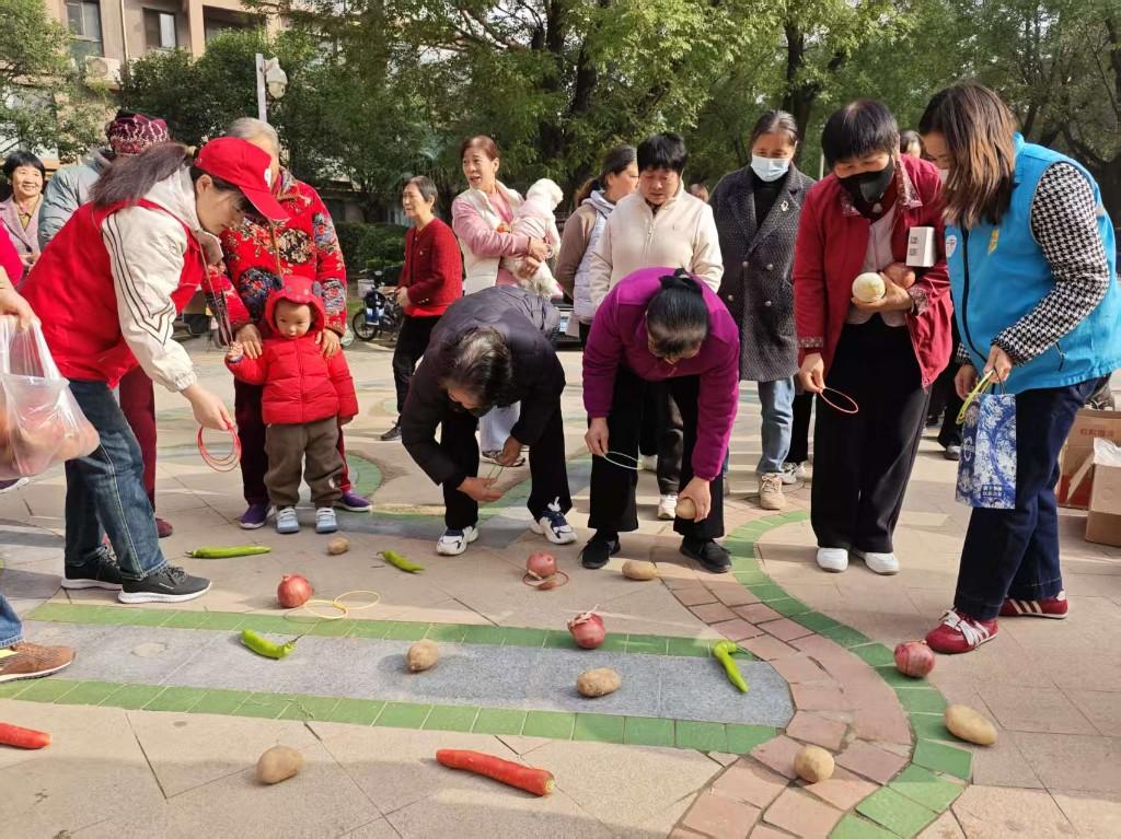 活动现场最热闹的莫过于“蔬菜套圈圈”游戏区。洋葱、土豆、辣椒等新鲜蔬菜替代传统玩具作为奖品,老人们兴致勃勃,纷纷踊跃参与。小小的套圈在空中划过,传递着欢乐,也让重阳节增添了童趣与生机。