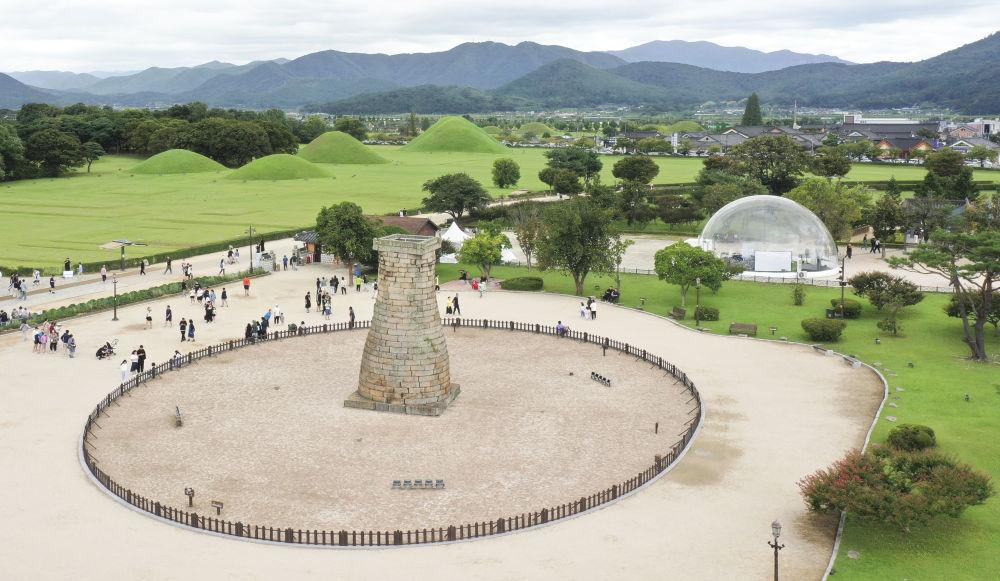 9月21日,游客在韩国庆州的历史古迹瞻星台附近游览(无人机照片)。