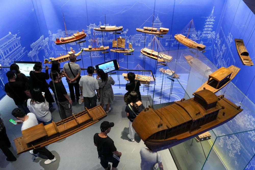 10月11日,游客在位于江苏省扬州市的中国大运河博物馆内参观。