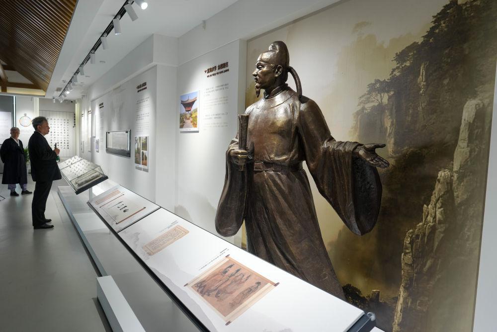 10月17日,市民在韩国庆州的“韩中友好林”公园里的崔致远铜像前观看崔致远生平介绍。