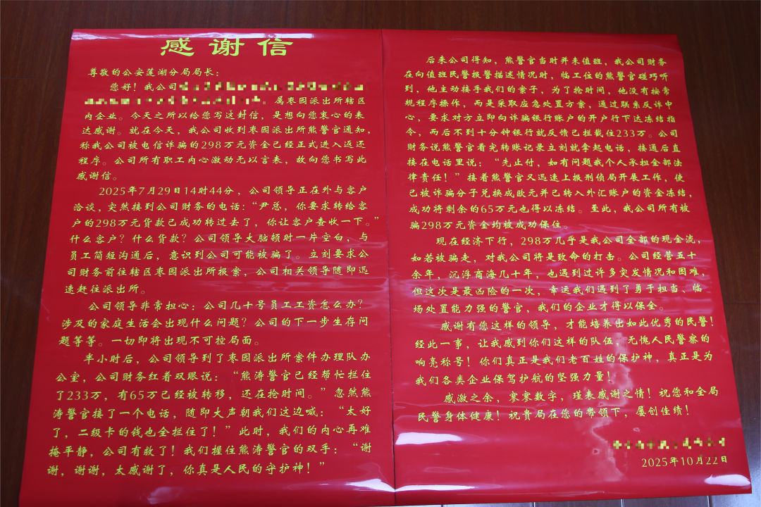 当最后一笔资金也确认被安全拦截的消息传来时,赶到派出所的公司领导再也抑制不住激动的心情,紧紧握住熊涛的手连声道谢。要知道,这笔资金是企业的重要现金流,关系着百名员工的生计和企业的未来。熊涛的及时出手,不仅帮企业守住了“救命钱”,更稳住了大家的心。