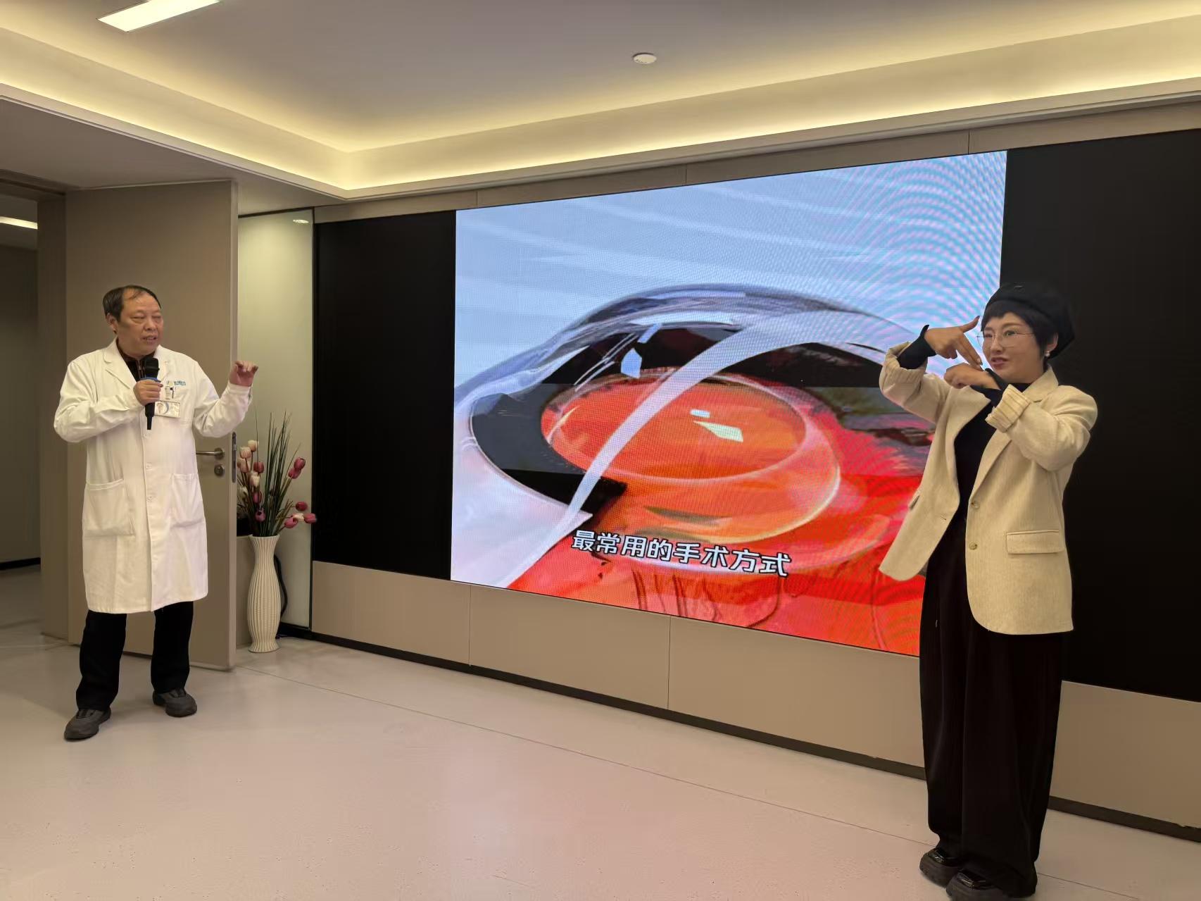 西安市普瑞眼科医院院长梁厚成带来了一场干货满满又通俗易懂的健康“课堂”。他没有采用晦涩的专业术语,而是通过一个个真实鲜活的眼科治疗案例,深入浅出地为听障朋友们科普眼科康复知识与眼病预防要点。那些关于重见清晰世界的故事,让在场者深刻认识到守护眼部健康的重要性。更令人动容的是,医院特别邀请了几位眼科治疗成功的听障朋友上台分享。他们用娴熟的手语,一字一句传递着康复后的喜悦与对医院的感激,真挚的情感感染了现场每一个人,不少人眼中泛起了温暖的泪光。