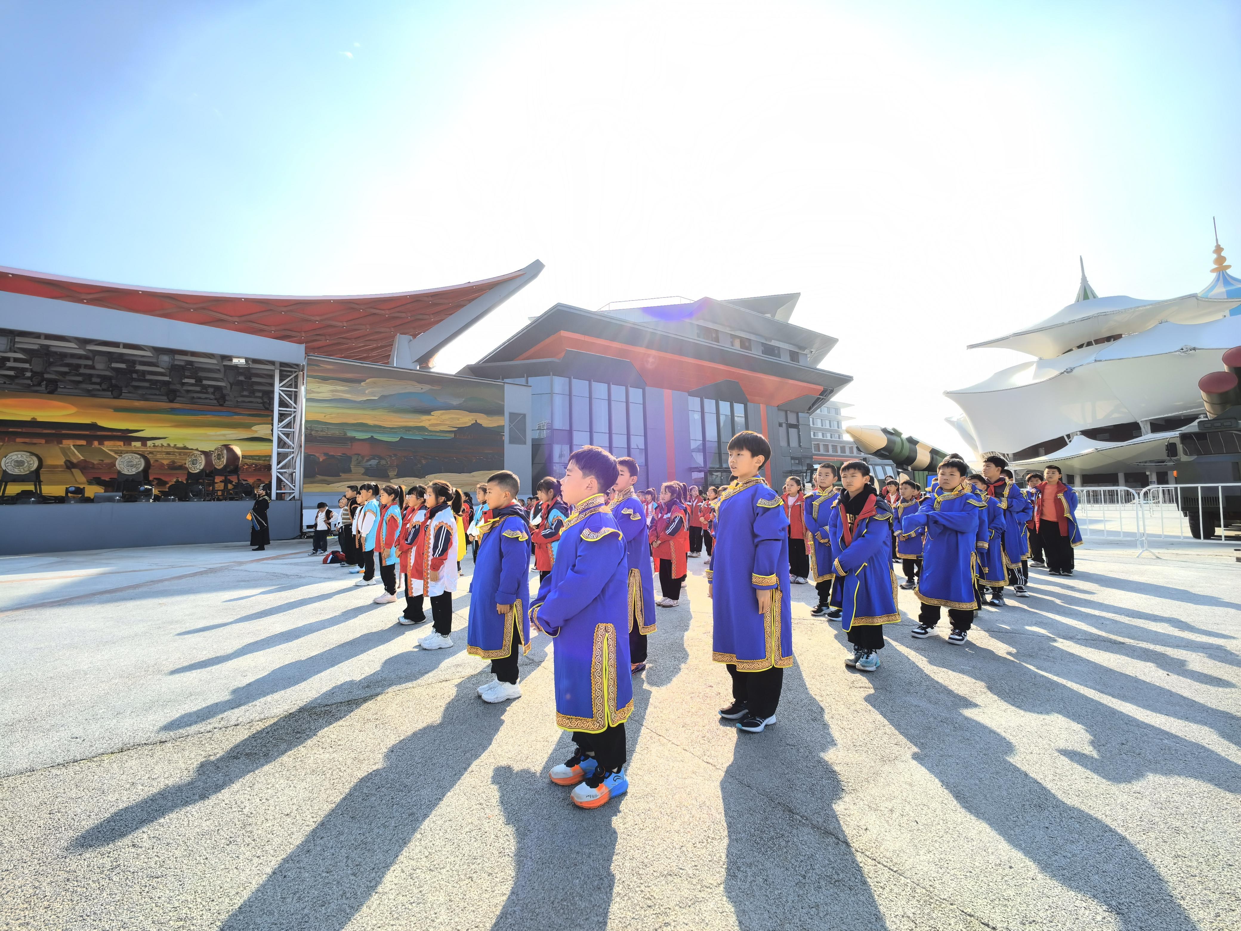 活动中,场面最震撼的部分是《万国来朝》,在老师指导下,同学们学习传统礼仪,躬身行礼,体验“万国朝拜”的盛景。随后,他们演员换上异域华服,化身“丝路使者”,亲历商贸往来与文化交融,感受中华文明的开放与包容。