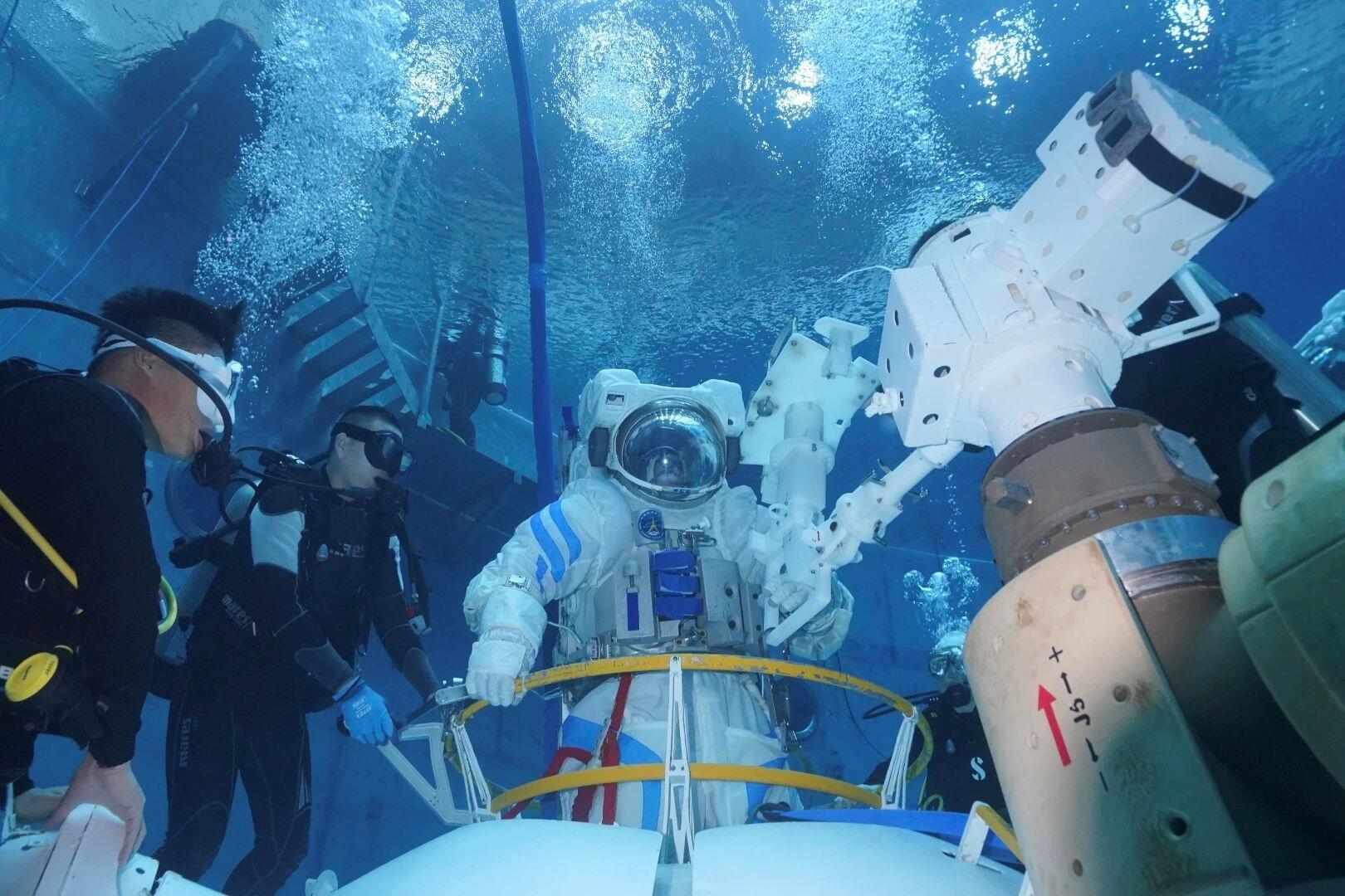 △航天员武飞水下出舱活动训练前进入水下训练服