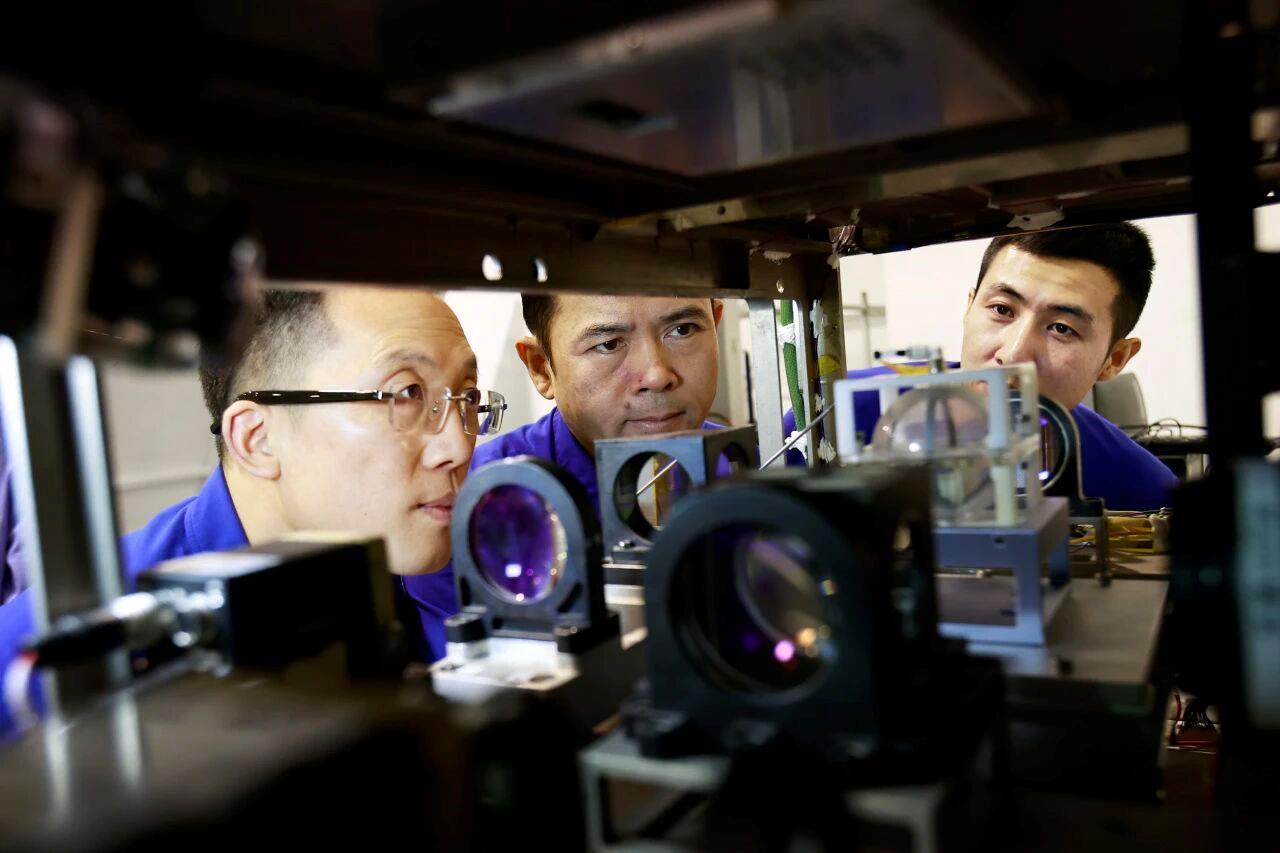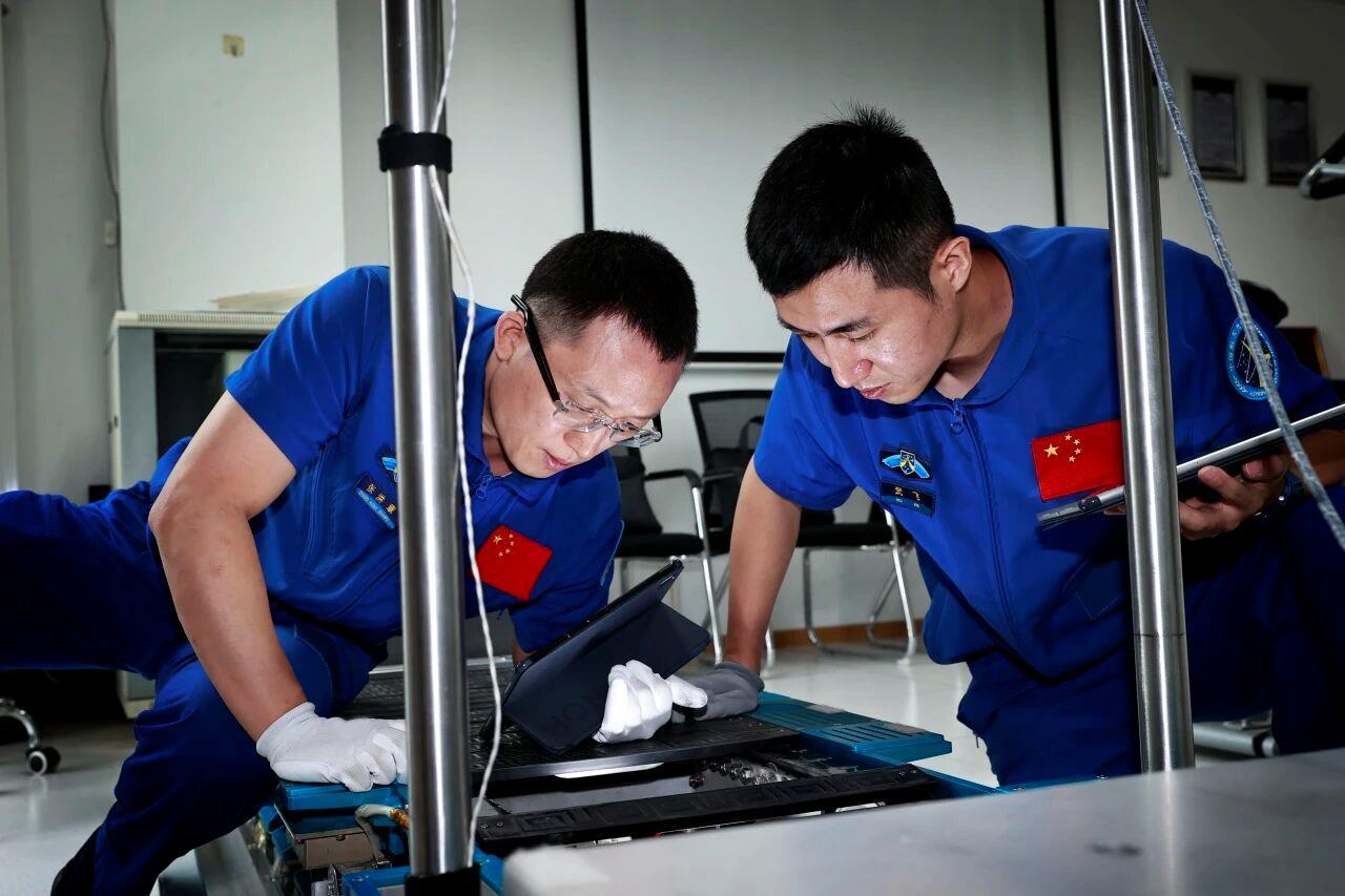 △航天员张洪章(左)、武飞(右)在进行设备维修训练