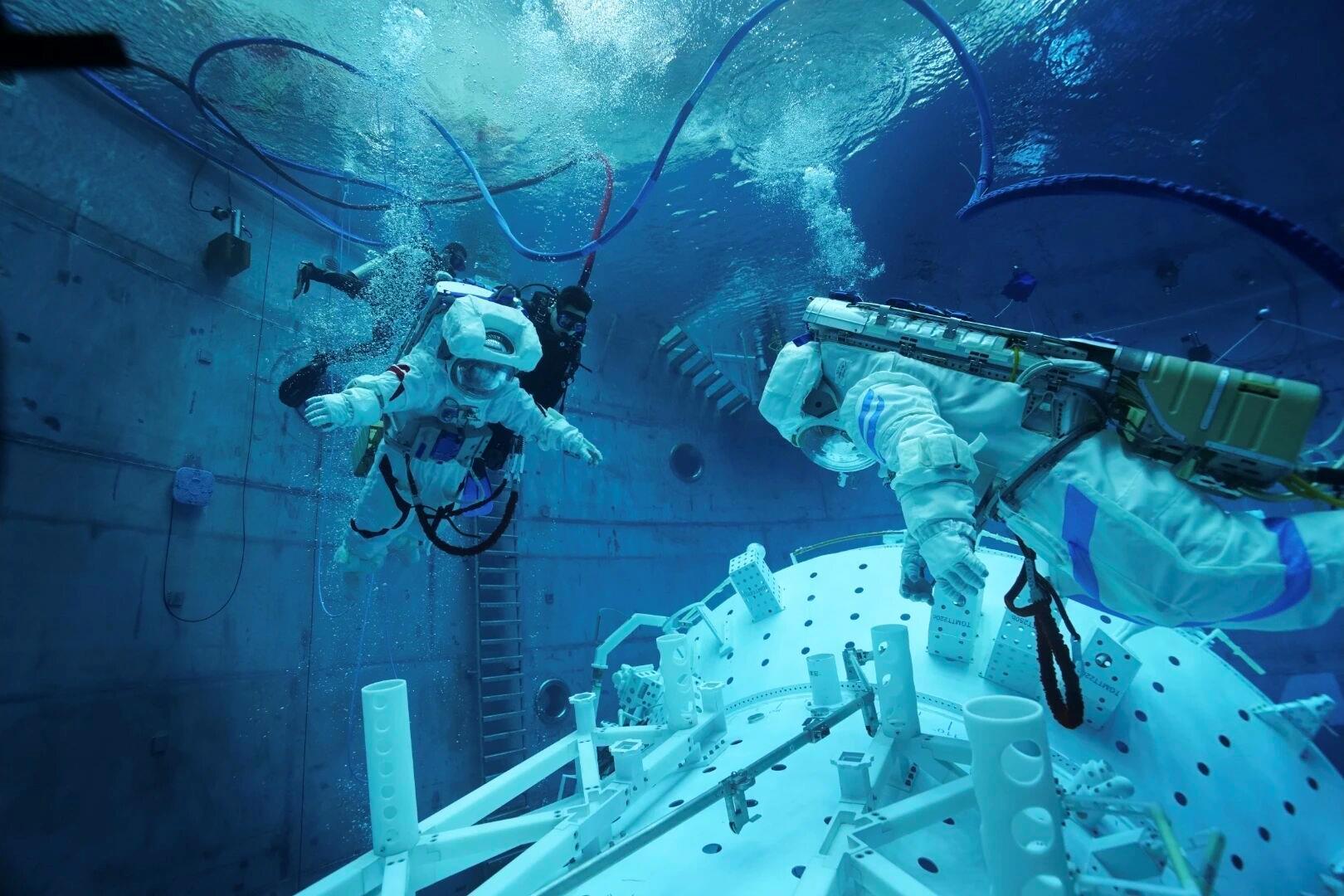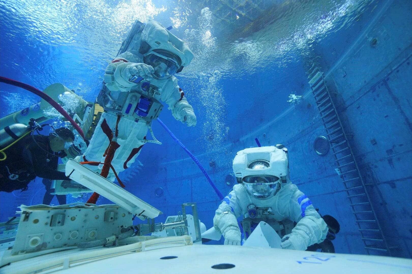 △航天员张陆(左)和张洪章(右)在进行水下出舱活动训练
