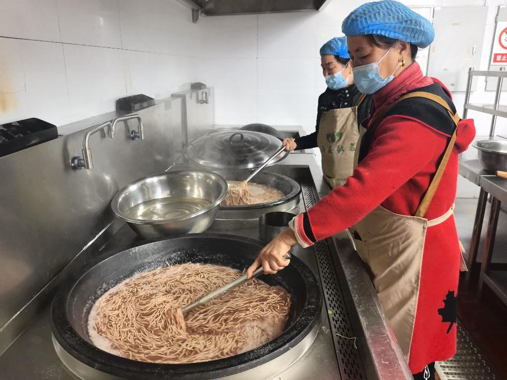 厨房里,热气升腾。每天8时许,刘宁便等几位银发志愿者赶来备菜,周一到周五,这里要为八九十位老人准备午餐,面条、大烩菜、麻什、馒头和稀饭等轮换供应,菜品软硬适中。