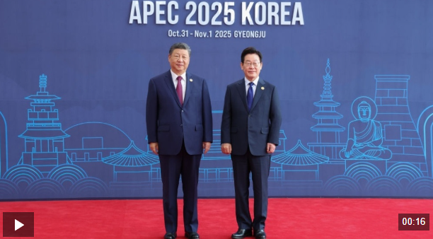 当地时间10月31日上午,亚太经合组织第三十二次领导人非正式会议第一阶段会议在韩国庆州和白会议中心举行。习近平抵达会场时,韩国总统李在明热情迎接,两国元首握手合影。