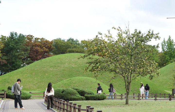 庆州市中心的大陵苑是1000多年前新罗王朝时期的墓葬群,这里共有20多座王陵与贵族墓,隆起的“土堆”错落有致,构成一片静默的波浪。草坡的绿意仍在延续,枝头的柿子却已被秋阳染成金黄。一树一丘,一黄一绿,如油画般层次分明,古老的王陵在这柔和的色调中更显宁静和浪漫,恰是庆州秋天最静美的时刻。