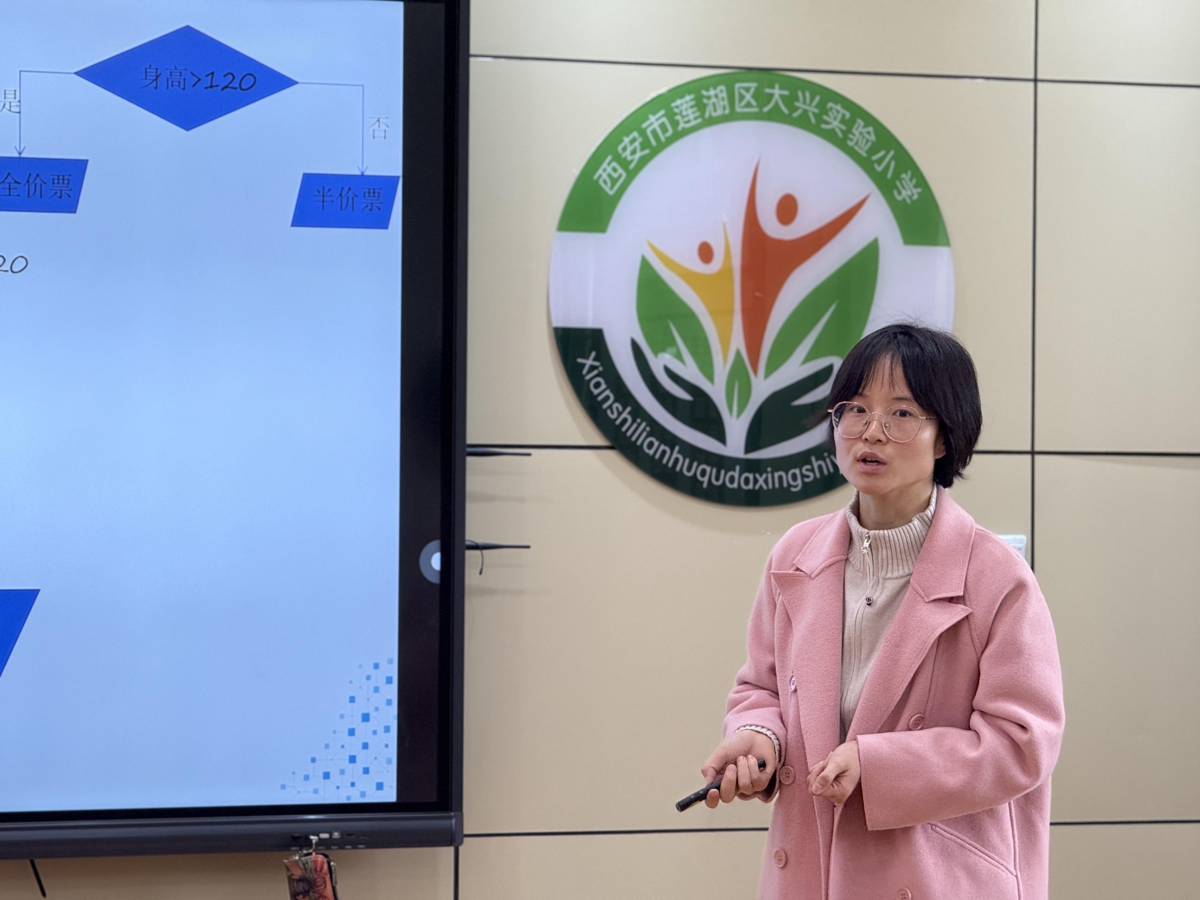 信息教师孙黛娜在《判断选择用分支》一课中,以“科技馆购票”生活场景引入分支结构概念,通过交互式视频技术帮助学生自然建构知识。在“过马路决策”环节,引导学生将分支模型应用于复杂场景,培养系统性判断能力。通过对比“电影院检票”与购票案例,辨析“双分支”与“单分支”结构的异同,实现从理解概念到优化思维的进阶。