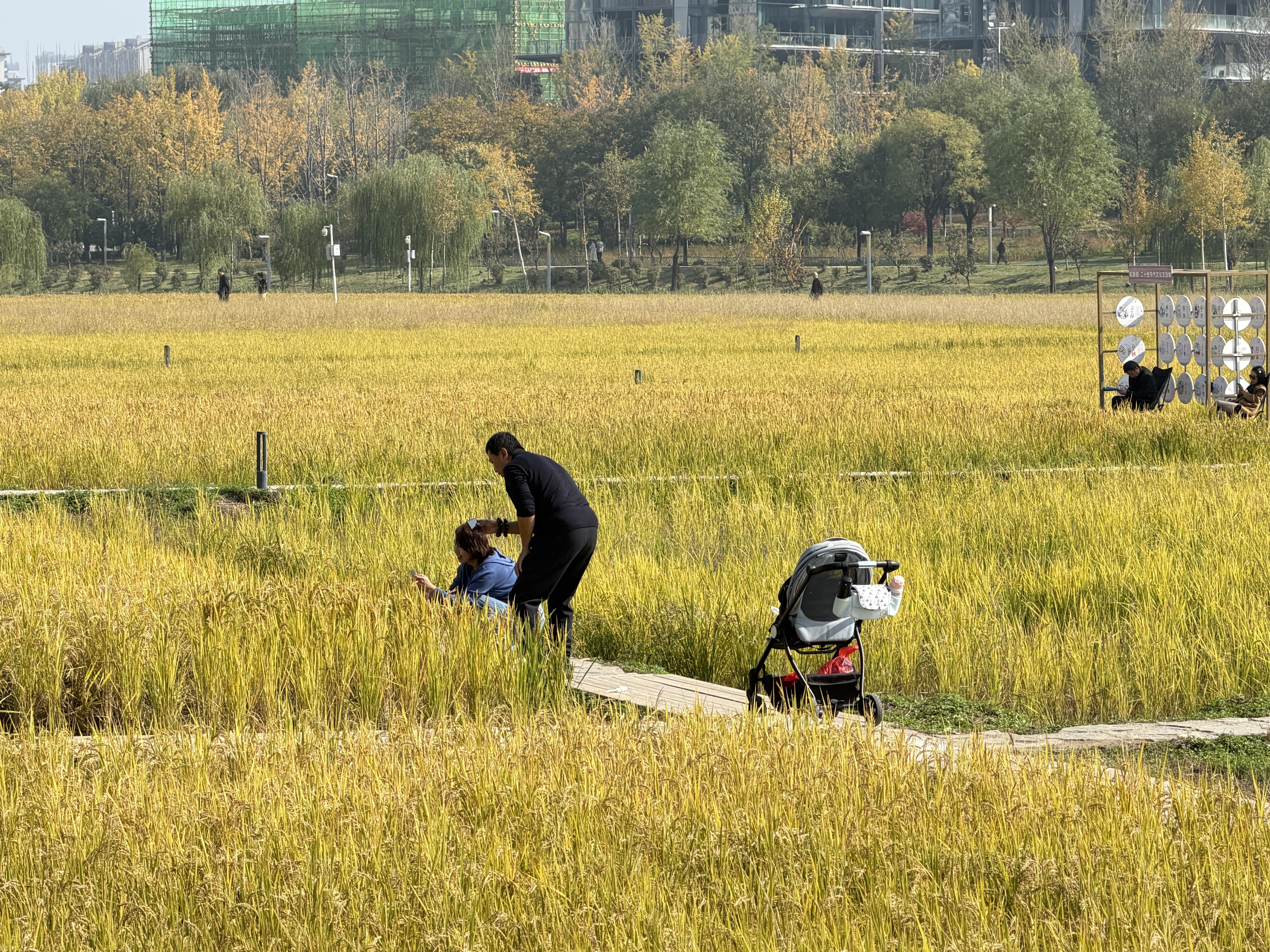 走进长安公园农耕功能区核心——稻香园,木栈道旁的稻田里,沉甸甸的稻穗弯腰颔首。7 岁女孩朵朵拉着妈妈的手在栈道上奔跑,兴奋地喊着:“快看,稻子都弯着腰呢!” 家长们借此机会,指着稻穗向孩子讲述 “盘中餐” 的由来,让 “粒粒皆辛苦” 的道理有了鲜活具象的注解。作为北方城市中少见的连片稻田,这里不仅是高颜值景观,更是生动的自然课堂。