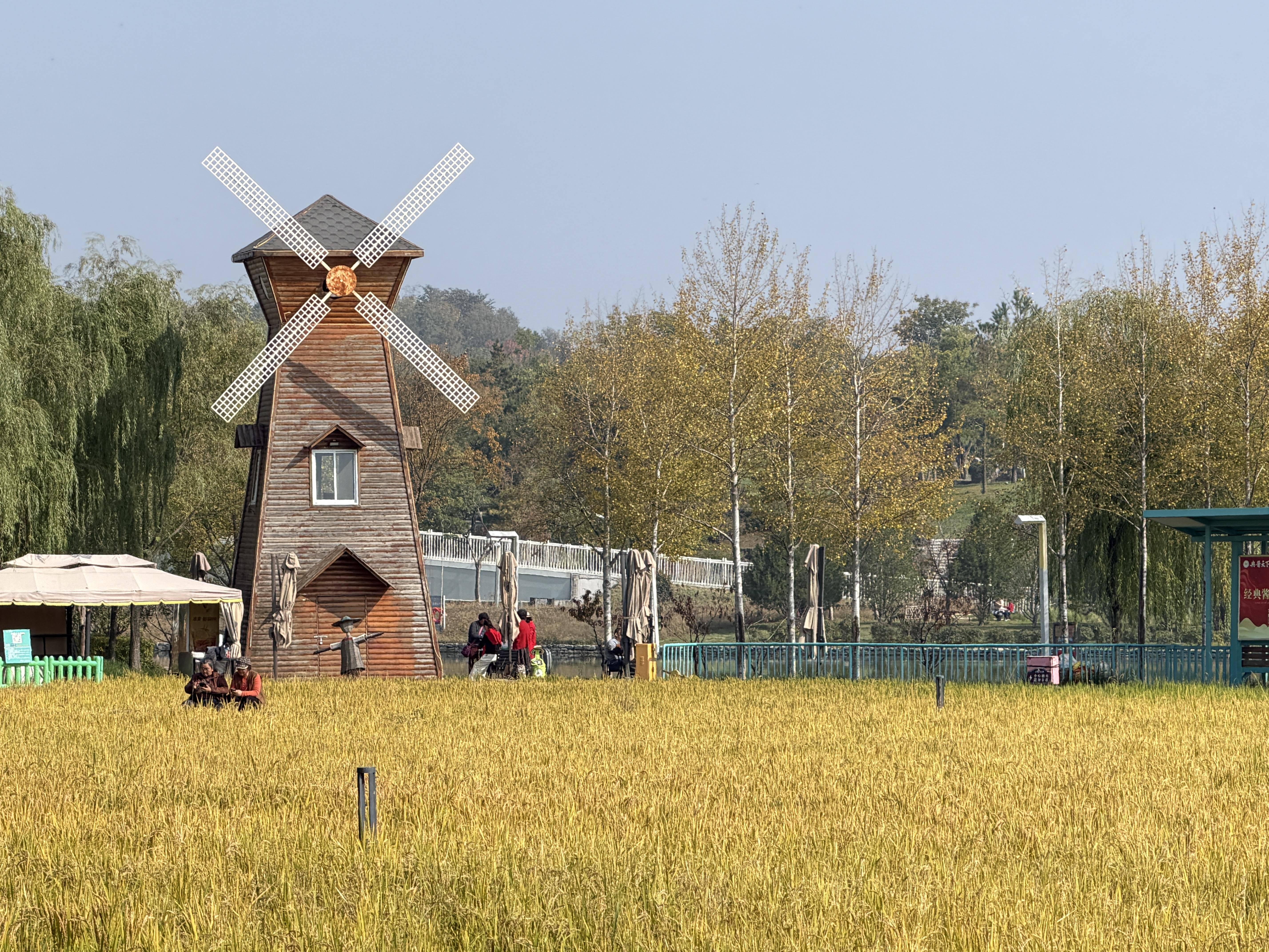 为让市民深度参与其中,稻香园配套了完善的体验设施。环绕稻田的小火车轨道上,观光列车缓缓驶过,乘客透过车窗便能触摸到稻穗;西侧的大风车既是园区地标,也是登高观景的绝佳地点,登上二层平台可俯瞰整片田园画卷;田埂间的停留平台和二十四节气文化墙,为休闲时光增添了几分文化韵味。去年秋天,公园还在配套建筑前的台阶平台举办音乐会,稻香与旋律交融,成为市民心中难忘的记忆。